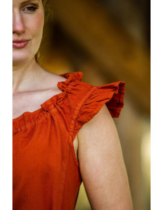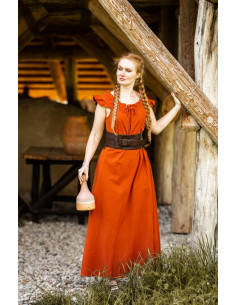 Il modello Clara si distingue per il suo design senza maniche, che aggiunge un tocco di freschezza e libertà al tuo outfit medievale. Il suo colore arancione scuro aggiunge un tocco vibrante e accattivante al tuo aspetto, facendoti risaltare in ogni occasione.