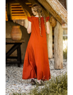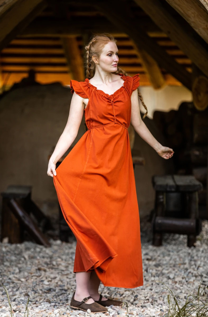 Immergiti nello splendore medievale con l'abito lungo modello Clara in un accattivante color arancio scuro. Questo magnifico abito ti riporterà indietro nel tempo con il suo stile elegante e senza tempo. Realizzato in 100% cotone, ti offre comfort e autenticità durante i tuoi eventi medievali.