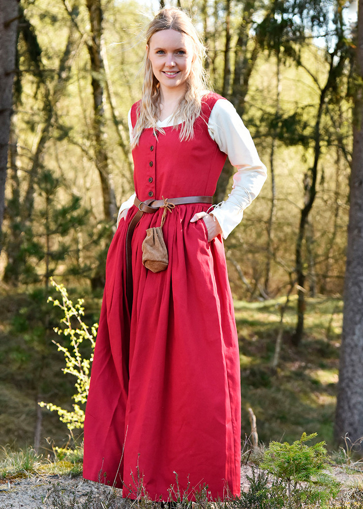 Scopri il fascino del medioevo con l'abito medievale smanicato rosso di Lene! Questo meraviglioso vestito è realizzato in cotone di alta qualità, che garantisce un incredibile comfort e morbidezza quando indossato.