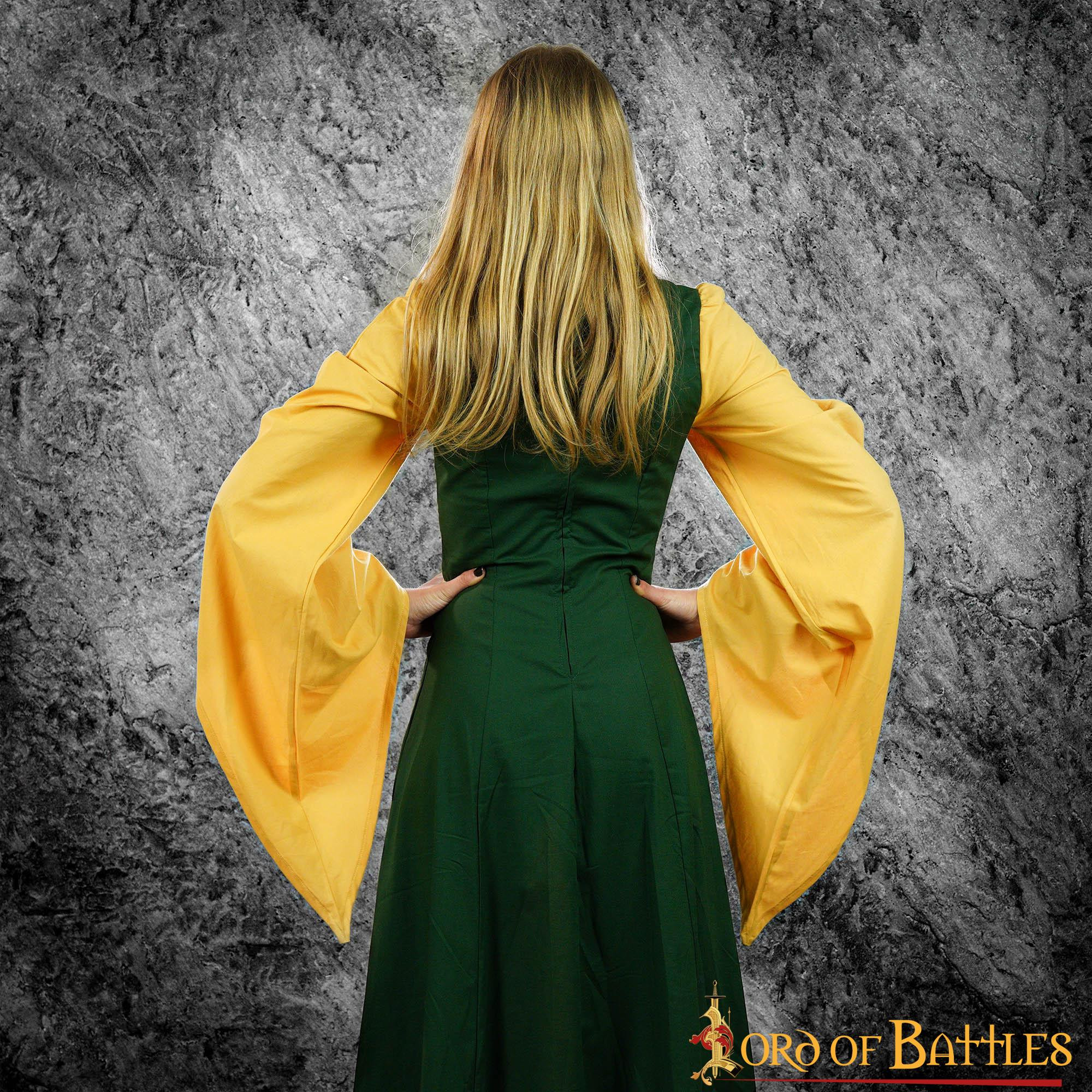 Questo vestito è perfetto per tutti i tipi di feste d'epoca, come feste o matrimoni medievali. Il suo design ei suoi colori nei toni del senape e del verde bottiglia evocano l'eleganza e l'opulenza della nobiltà medievale, facendoti sentire una vera cortigiana.