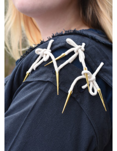 Le estremità dei lacci sono dotate di puntali in metallo che facilitano l'infilatura. Ti consigliamo di aprire solo l'allacciatura centrale anteriore, in modo da poterla infilare e infilare nuovamente i lacci per chiuderla. Anche le maniche sono legate alle spalle con cordini intrecciati e possono essere facilmente rimosse. Questo abito medievale è adatto alla rappresentazione di donne delle classi inferiori ed è ideale per la proprietaria di una taverna, un locandiere, una contadina o una donna vichinga. In ogni caso va indossato in abbinamento ad un indumento intimo o ad un farsetto, in quanto gli spacchi sul davanti, sul retro e ai lati della gonna permettono una visione molto profonda. Osa apparire spettacolare con questo abito medievale!