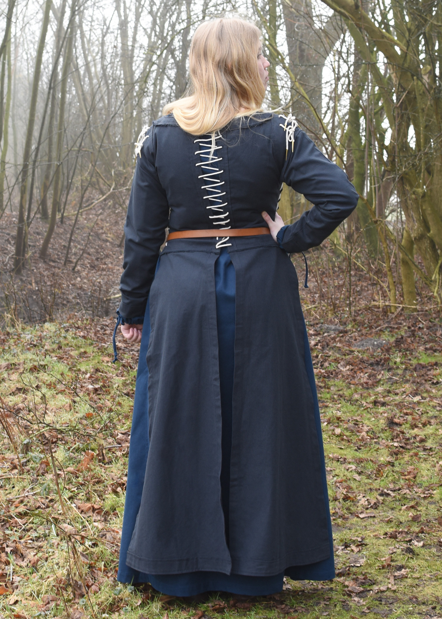 Scopri lo stile medievale con l'abito in pizzo Marit medievale in blu scuro. Questa sopravveste medievale ha un corpetto aderente e una gonna a trapezio.I lacci che corrono fino alla vita sostituiscono le solite cuciture divisorie e consentono di regolare la taglia per una vestibilità personalizzata. Se rimuovi tutti i lacci, puoi scomporre il vestito nelle sue singole parti.