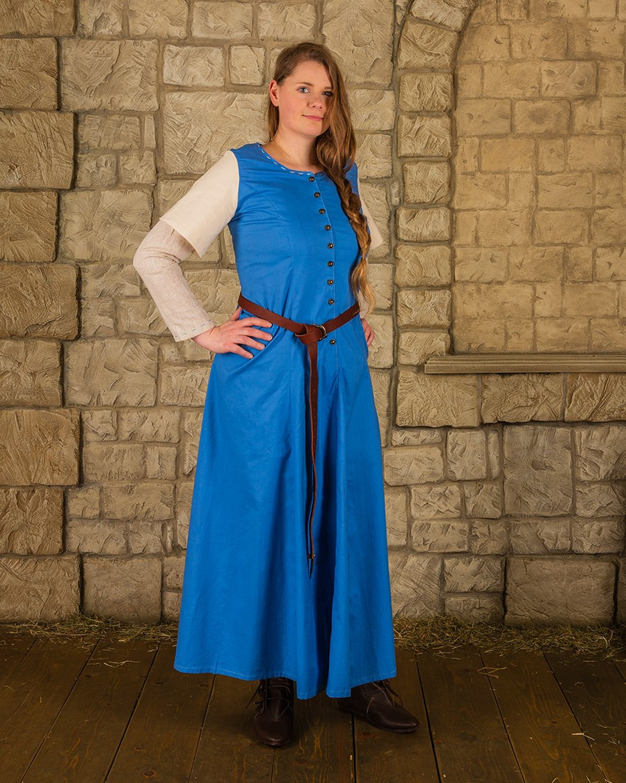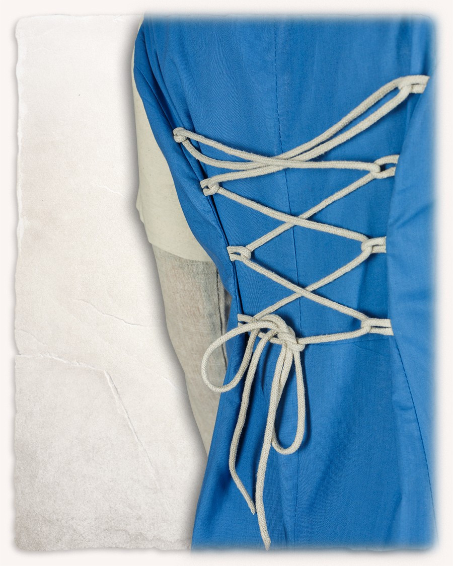 Immergiti nell'eleganza medievale con l'abito medievale modello Elodie in blu-crema. Questo abito bicolore presenta cuciture decorative cucite a mano ed è realizzato in cotone leggero con maniche in lino arioso. La taglia e la vestibilità possono essere ottimizzate attraverso l'allacciatura sul retro e si chiude con una lunga fila di bottoni sul davanti.