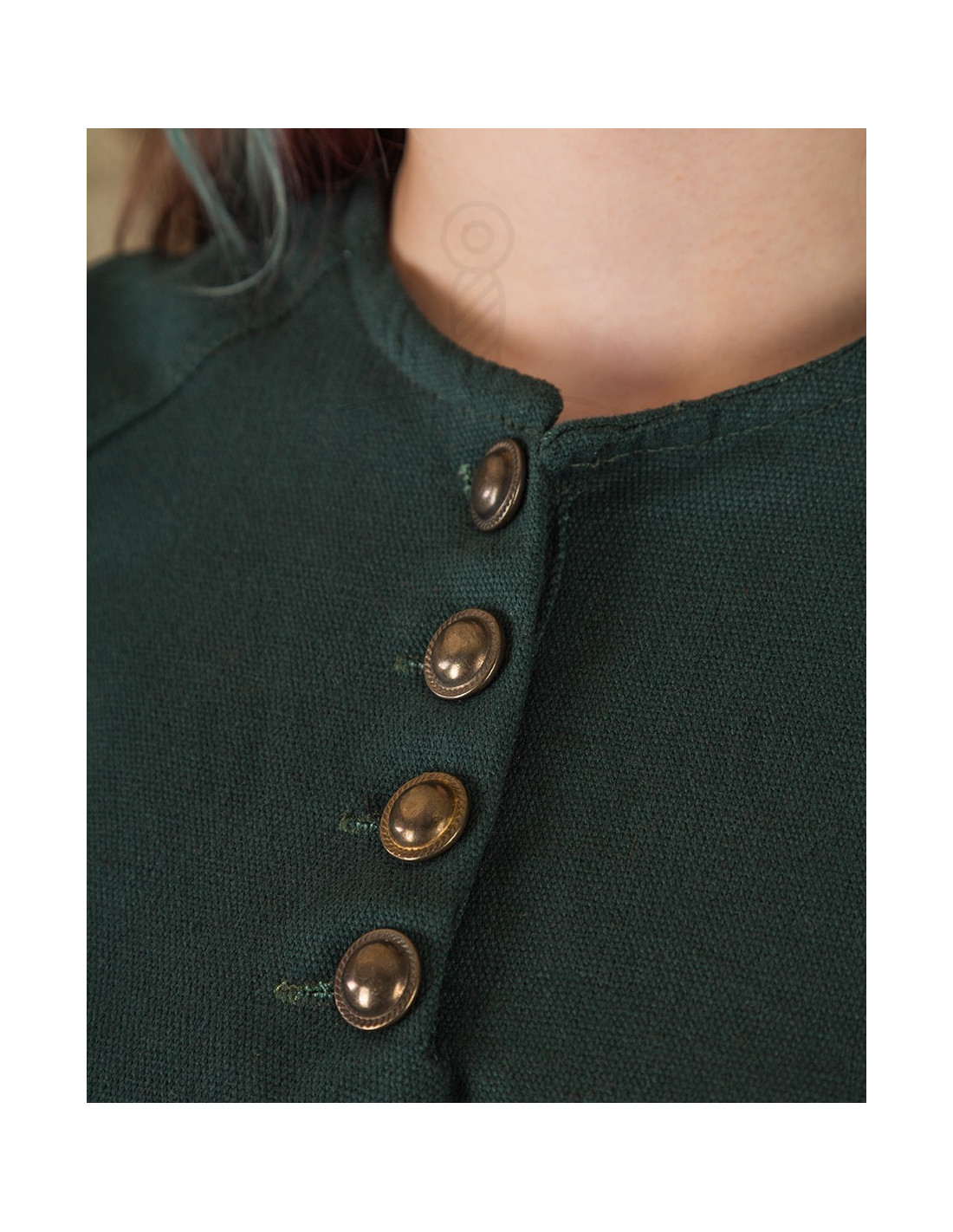 Scopri l'affascinante abito medievale modello Jovina in verde e trasporta il tuo stile nel medioevo. Questo abito dal taglio semplice è dotato di bottoni sul collo e sulle maniche. Realizzata in resistente tela di cotone, ti tiene al caldo nelle giornate più fresche e può essere indossata anche come semplice strato esterno.