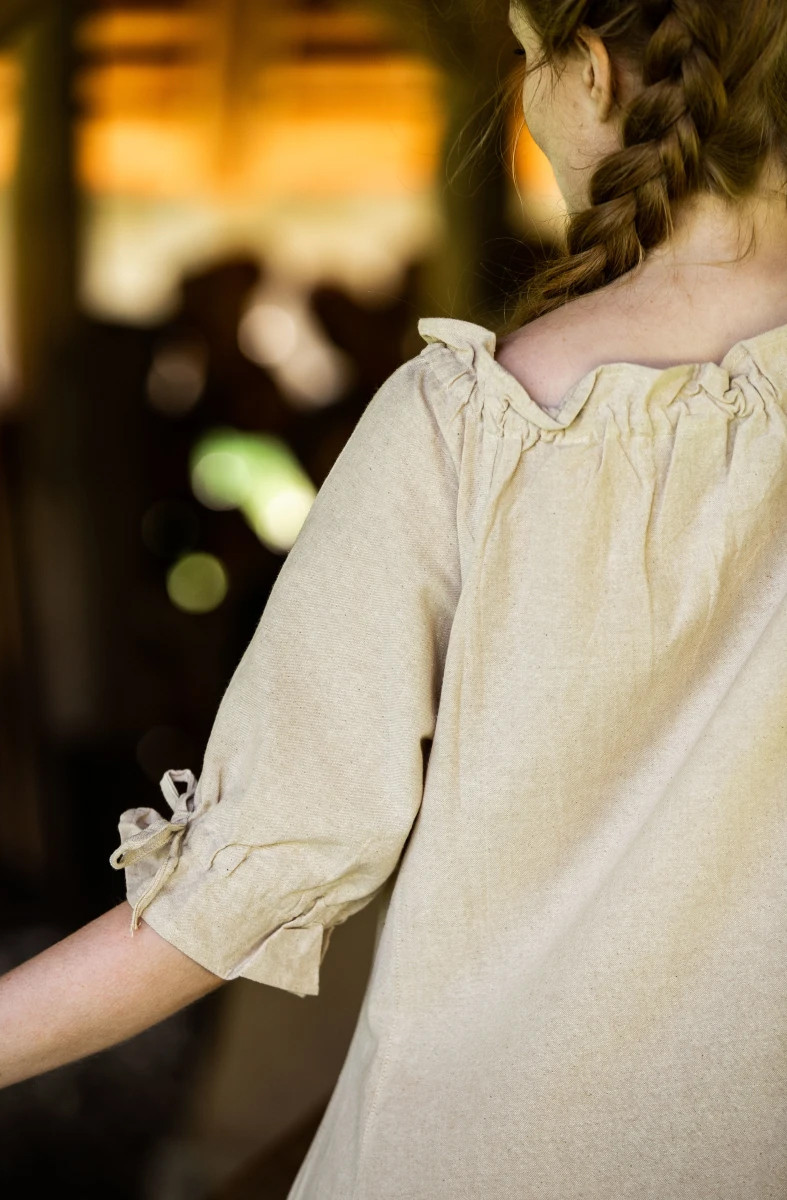 L'abito modello Melisande è caratterizzato da maniche corte che aggiungono un tocco di freschezza e versatilità al tuo outfit. Il suo colore canapa aggiunge un'aria di naturalezza ed eleganza al tuo aspetto medievale.