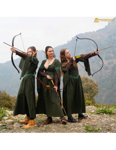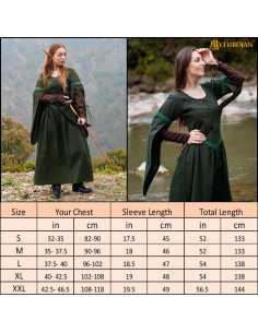 Il vestito presenta un elegante colore verde scuro con dettagli in verde chiaro nel collo e nella vita che valorizzano il suo design. Il suo taglio lungo e fluido, che arriva fino alle caviglie, si completa con ampie maniche a campana, conferendo un tocco sofisticato, autentico e medievale. Il colletto rotondo e i dettagli decorativi della vita si combinano per offrire uno stile semplice ma affascinante, ideale per personaggi come avventuriere, locandiere o elfe.
