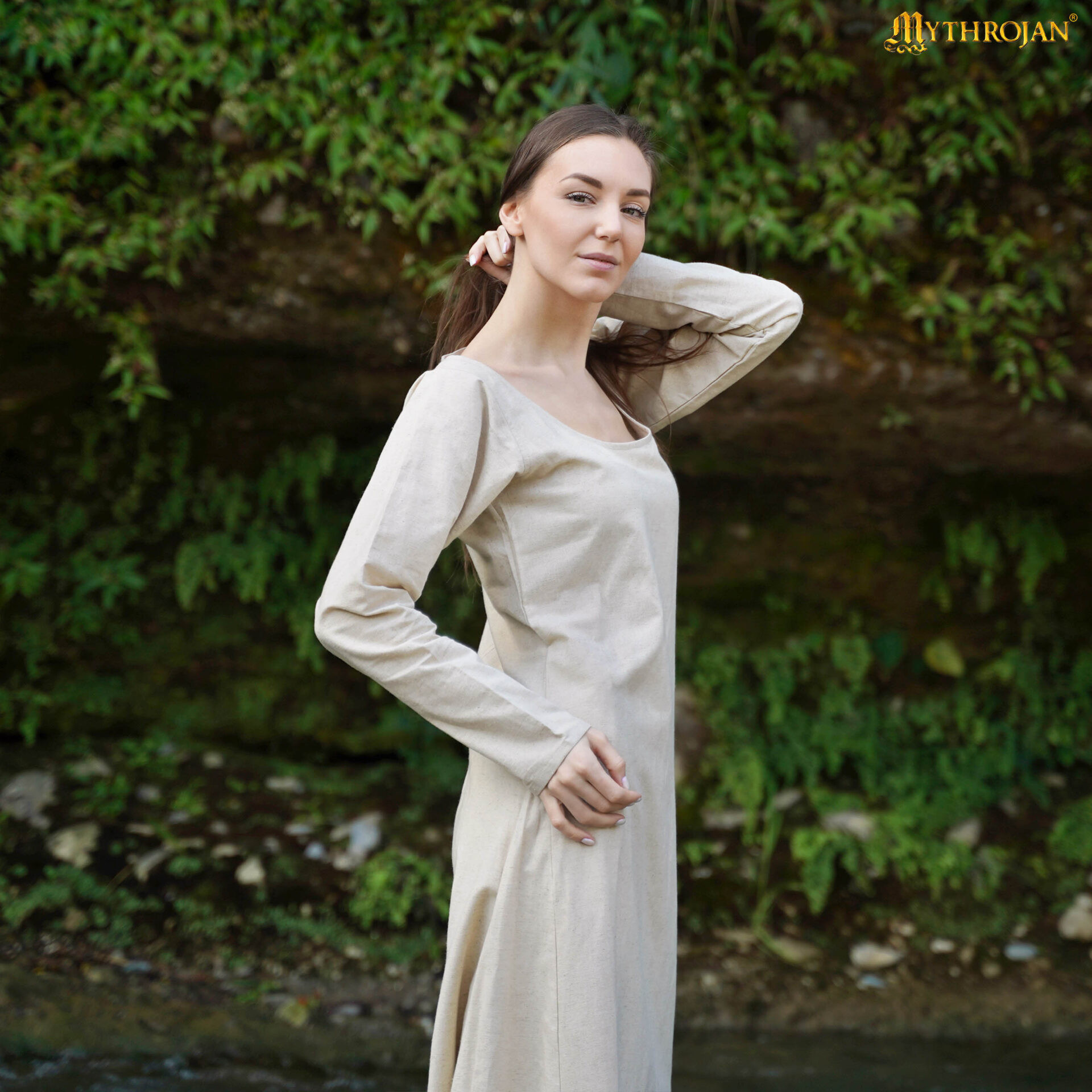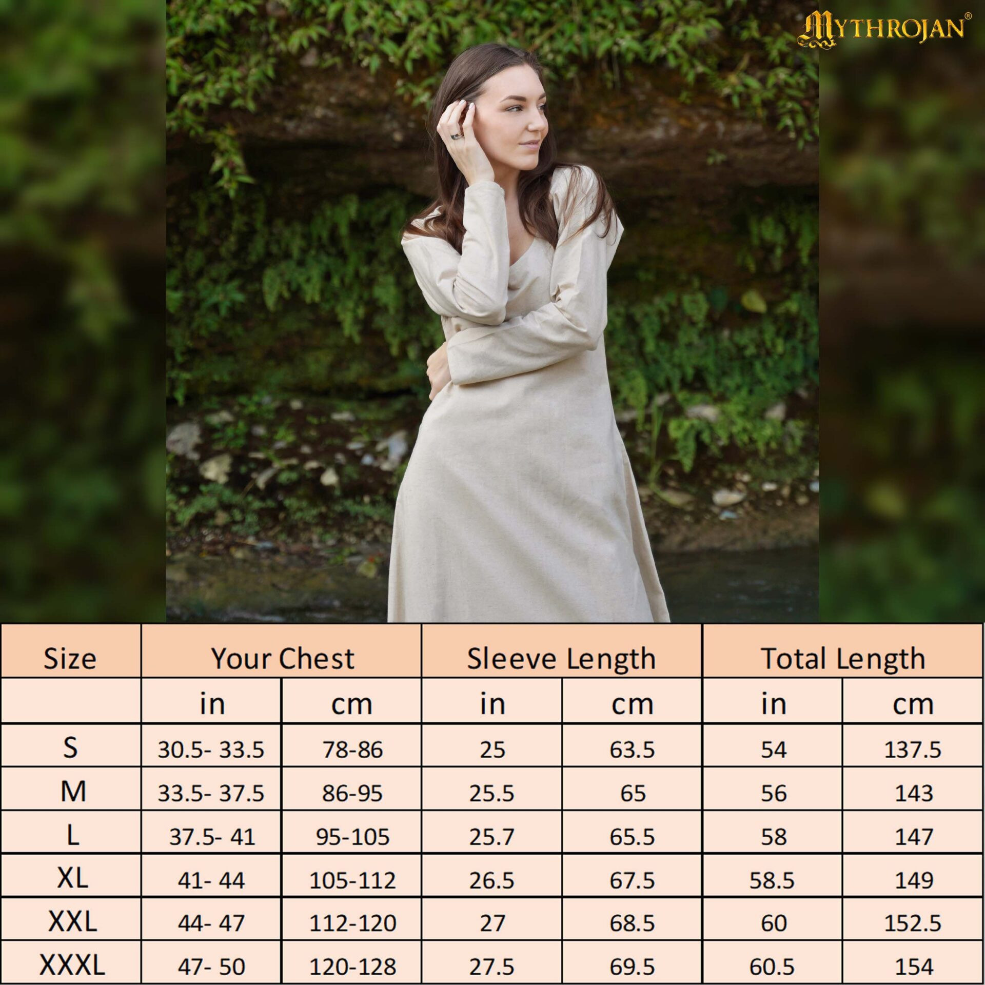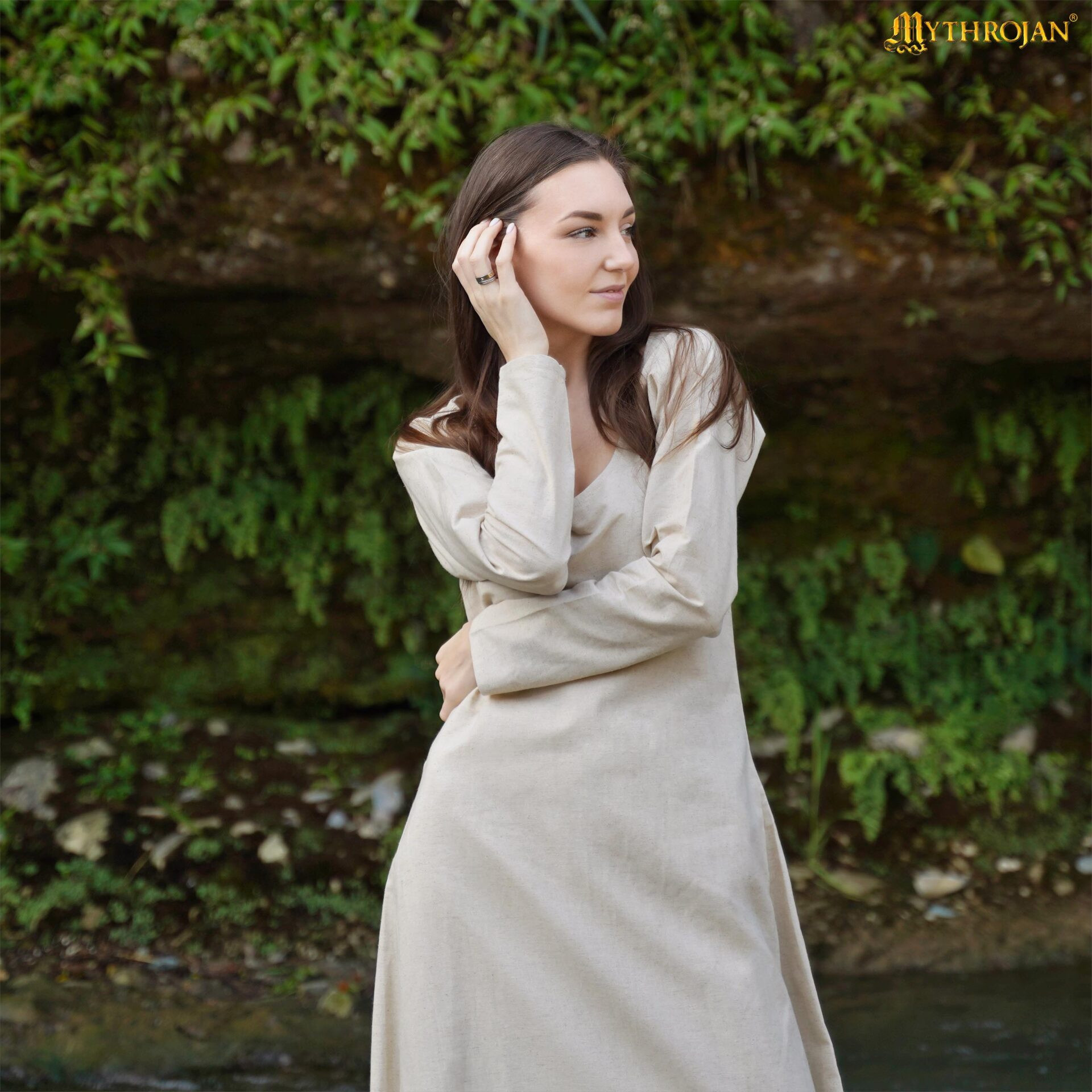 Ispirato ai capi indossati da donne di tutte le classi nell'Europa medievale e rinascimentale, questo vestito può essere usato da solo o come indumento intimo, conosciuto anche come chemise o shift, rendendolo perfetto da abbinare ad altri capi e creare diversi look storici o fantasy. Il suo design con costruzione a rettangoli e triangoli conferisce una silhouette fluida e confortevole, ideale per attività come reenactment, LARP, SCA o costumi per eventi a tema.
