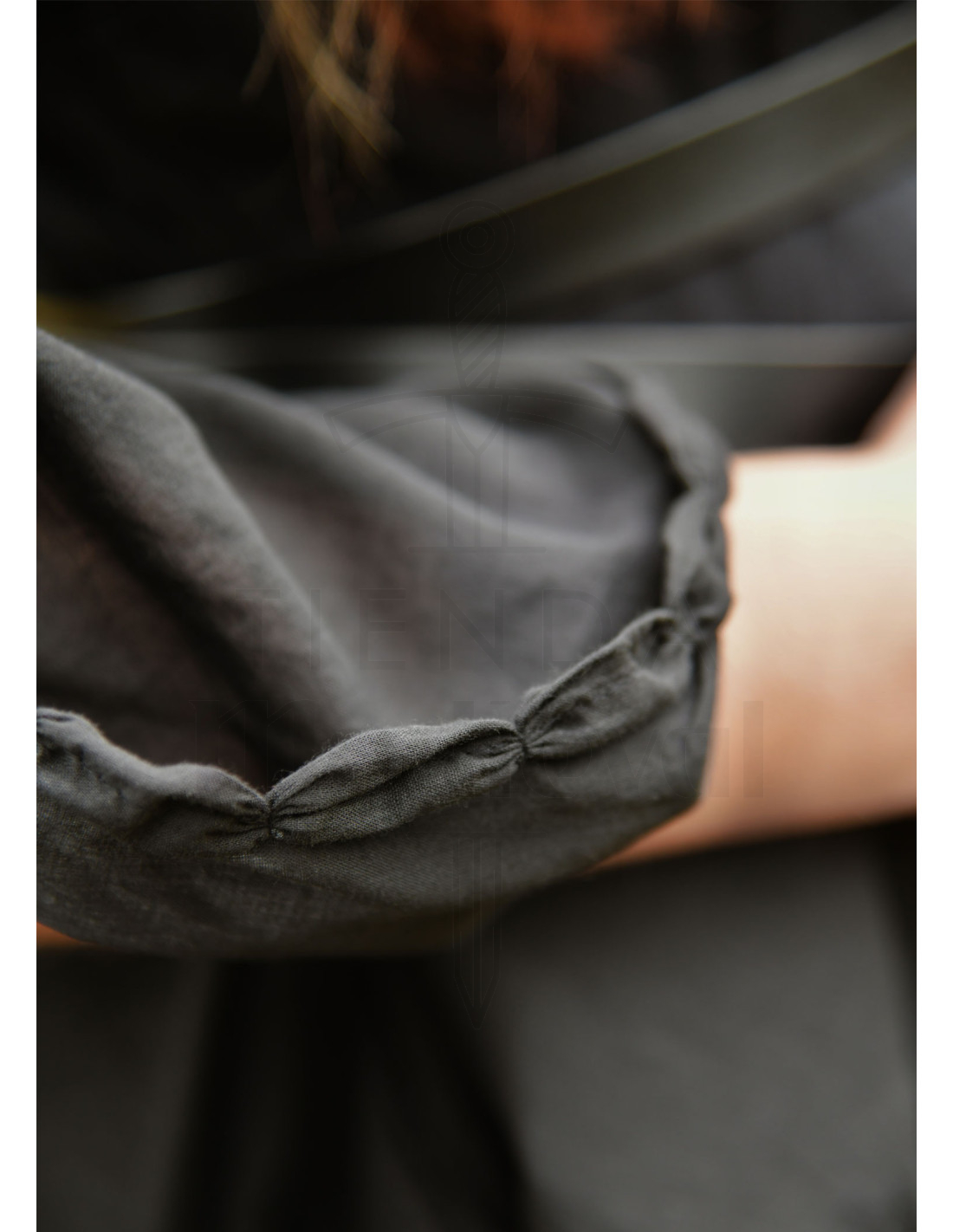 L'Abito medievale Ingrid con lacci sulla schiena, colore nero si distingue per la sua scollatura posteriore regolabile tramite un'elegante cordonatura, che consente di modellare la silhouette secondo la tua comodità, creando una vita definita senza perdere libertà di movimento. Le pince sul seno assicurano una vestibilità favorevole, mentre il tessuto di cotone offre una sensazione leggera e traspirante per indossarlo tutto il giorno.