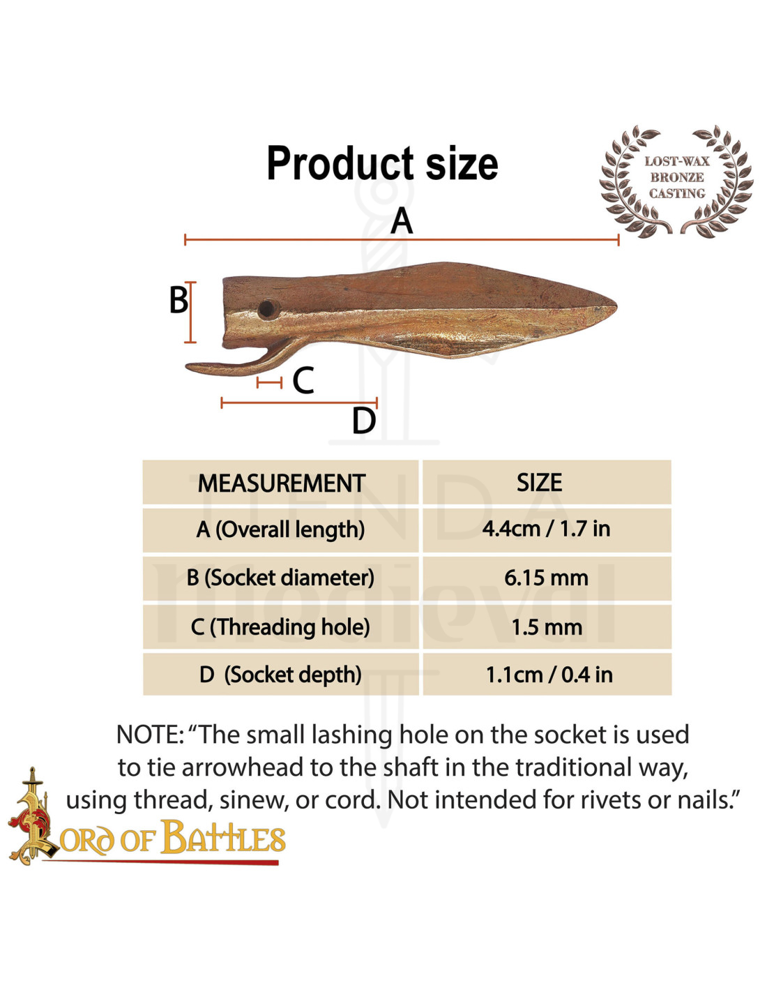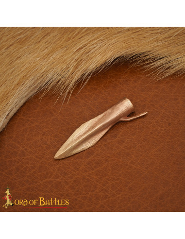 La riproduzione in bronzo d'epoca, realizzata mediante la tecnica antica della cire perdue, offre una finitura che trasmette autenticità e carattere, senza perdere la funzionalità. La sua lama a forma di foglia con chiglia centrale e la base con incastro e sperone posteriore garantiscono un montaggio sicuro su un'asta, fornendo stabilità ed efficacia in qualsiasi ricostruzione o montaggio di progetto proiettile, proprio come veniva utilizzato in tempi remoti.
