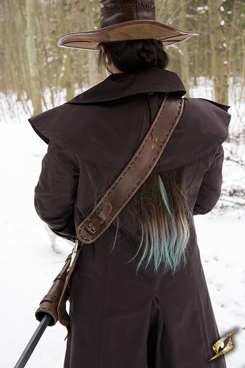 Scopri l'eleganza e lo stile della borsa a tracolla in pelle marrone pirata. Questa borsa a tracolla rinascimentale autoregolante è realizzata in pelle della migliore qualità, che ne garantisce durata e resistenza. Il suo design versatile e sofisticato lo rende perfetto per adattarsi a qualsiasi tipo di stocco o spada incrociata.