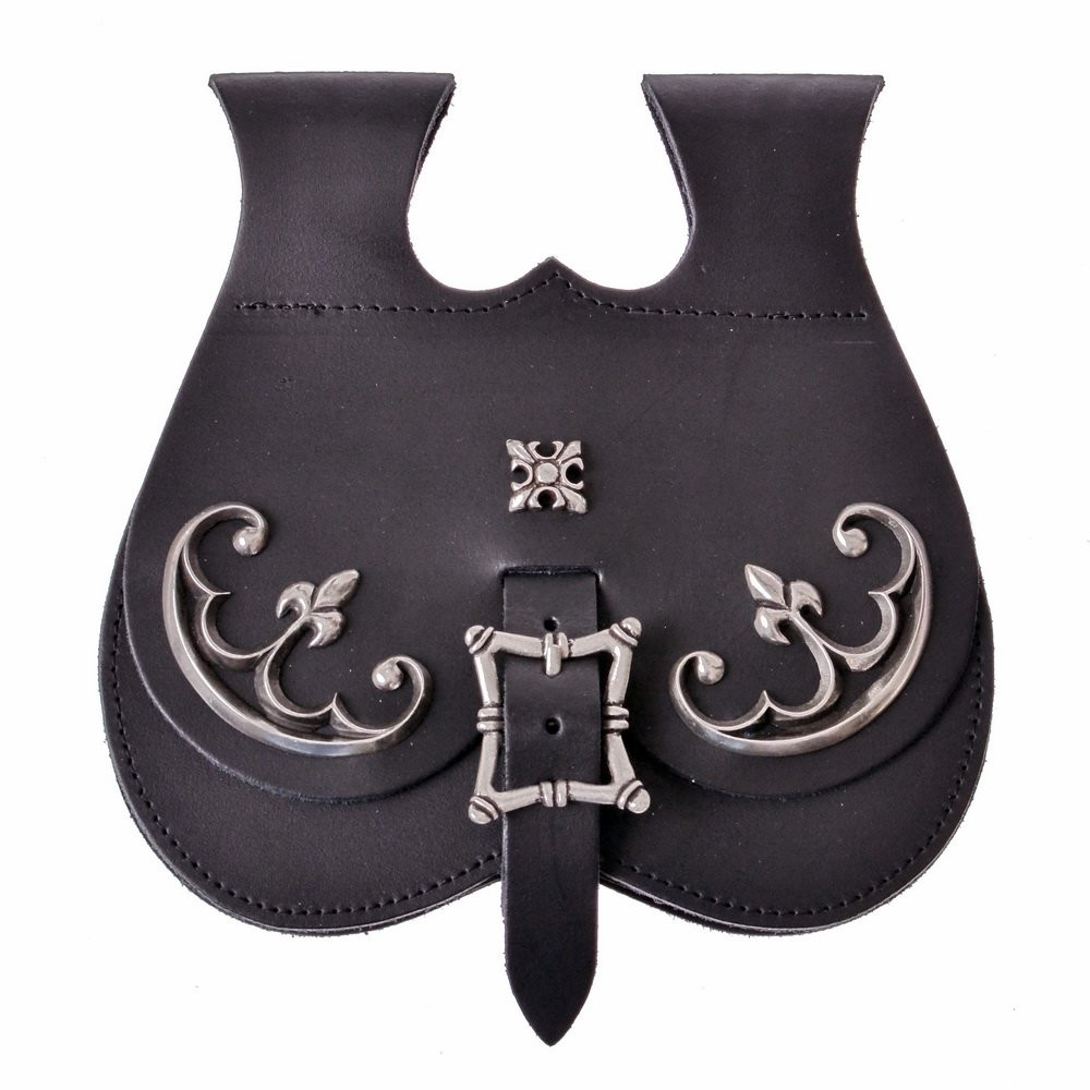 Marsupio da cortigiano medievale. Questo marsupio medievale spazioso e resistente è pensato per quei cortigiani che cercano stile e funzionalità. Realizzato con pelle di alta qualità, questo marsupio ha tre eleganti accessori a forma di fleur de lis, che gli donano un tocco di classe ed eleganza.