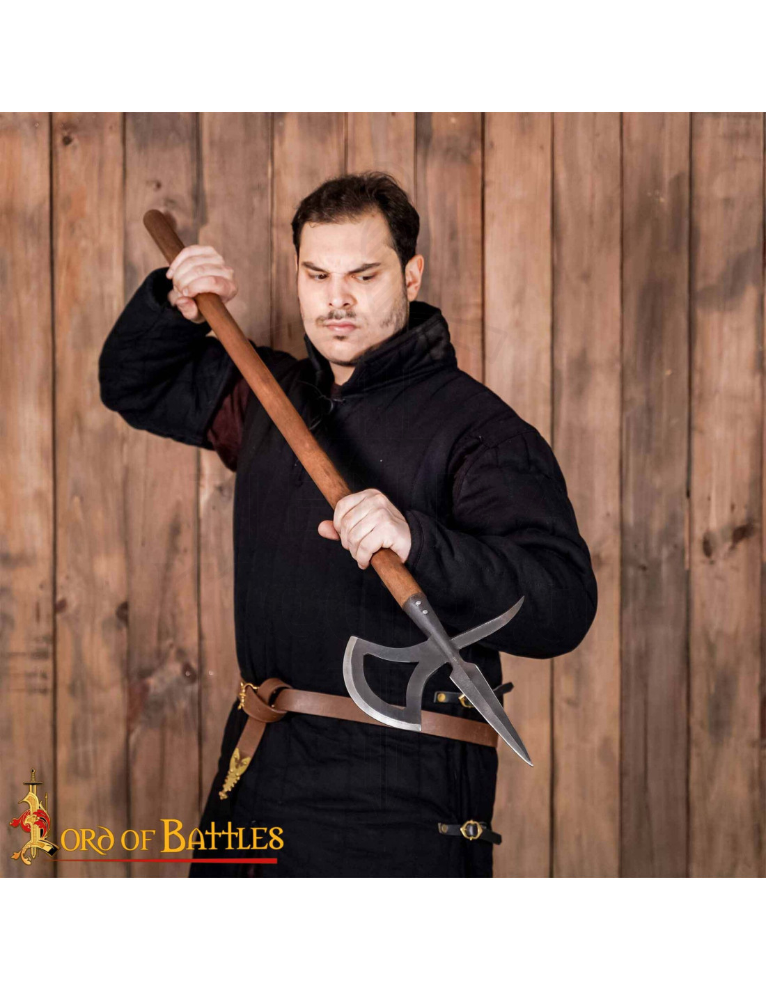 L'asta in legno di tonalità marrone medio è pensata per un maneggio a due mani con comodità, la sua lunghezza offre un convincente raggio d'azione nelle scene e dimostrazioni, e i rivetti visibili che fissano la lama rinforzano l'impressione di costruzione tradizionale, offrendo anche un'attrattiva visiva quando è esposta a parete o in vetrina.