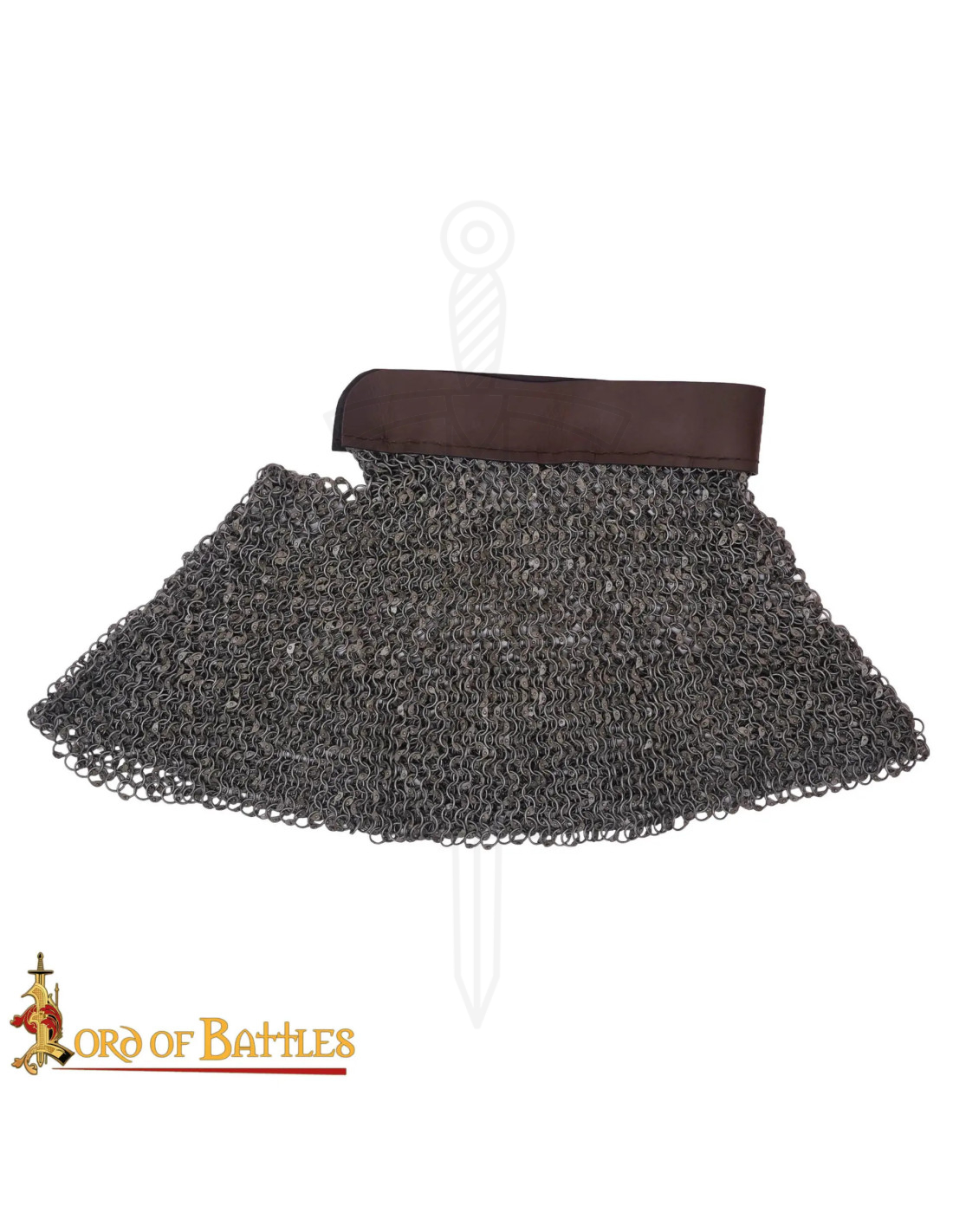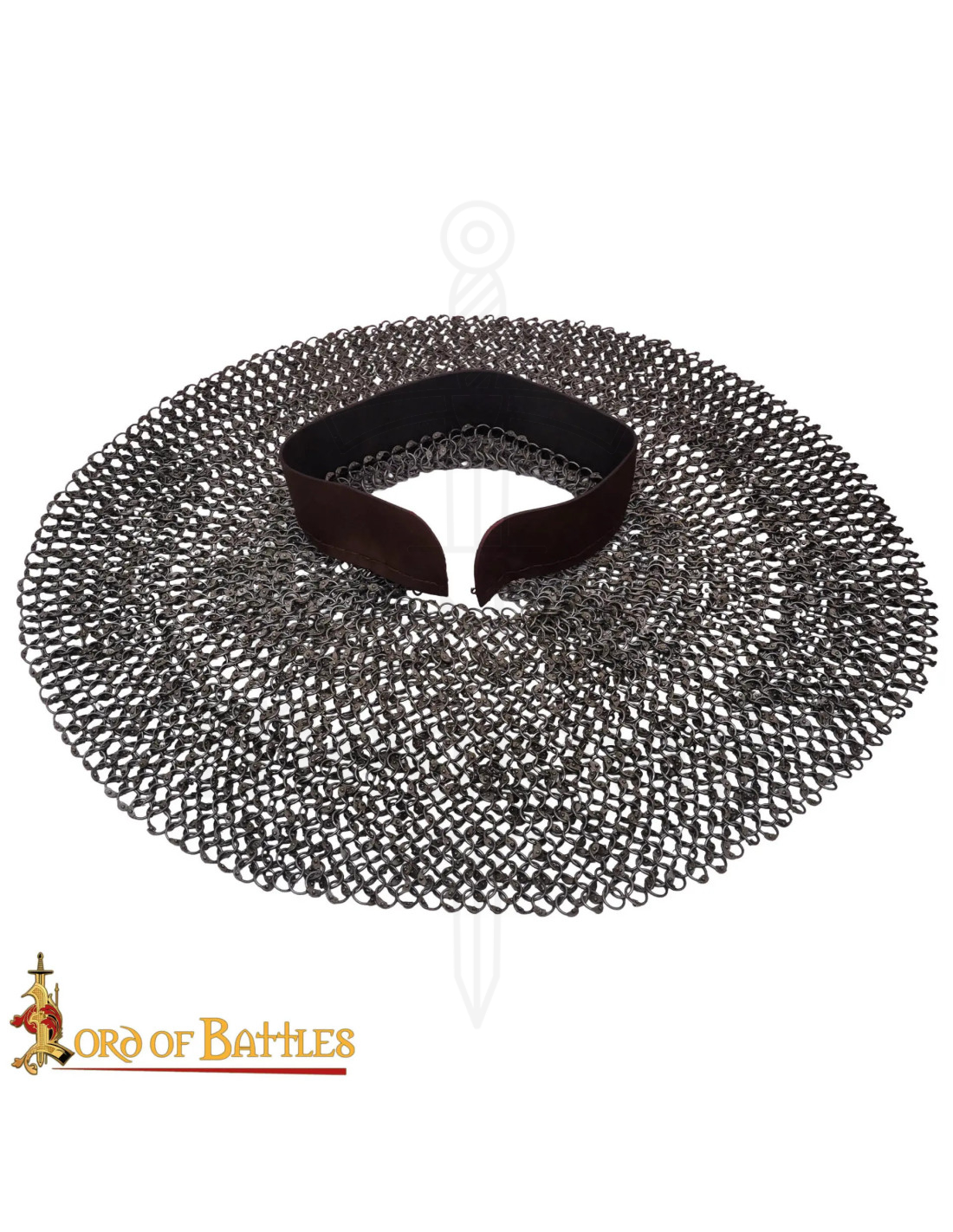Questa gorgiera combina un'estetica autentica con vantaggi pratici: la maglia a anelli ribattuti offre flessibilità per guardare, girare e combattere, mentre la banda di cuoio reale alla base garantisce una vestibilità confortevole e previene irritazioni. La finitura scura e opaca conferisce un aspetto sobrio che complementa e valorizza elmi e cotte, perfetto sia per ricreazioni storiche che per allenamenti o rappresentazioni.