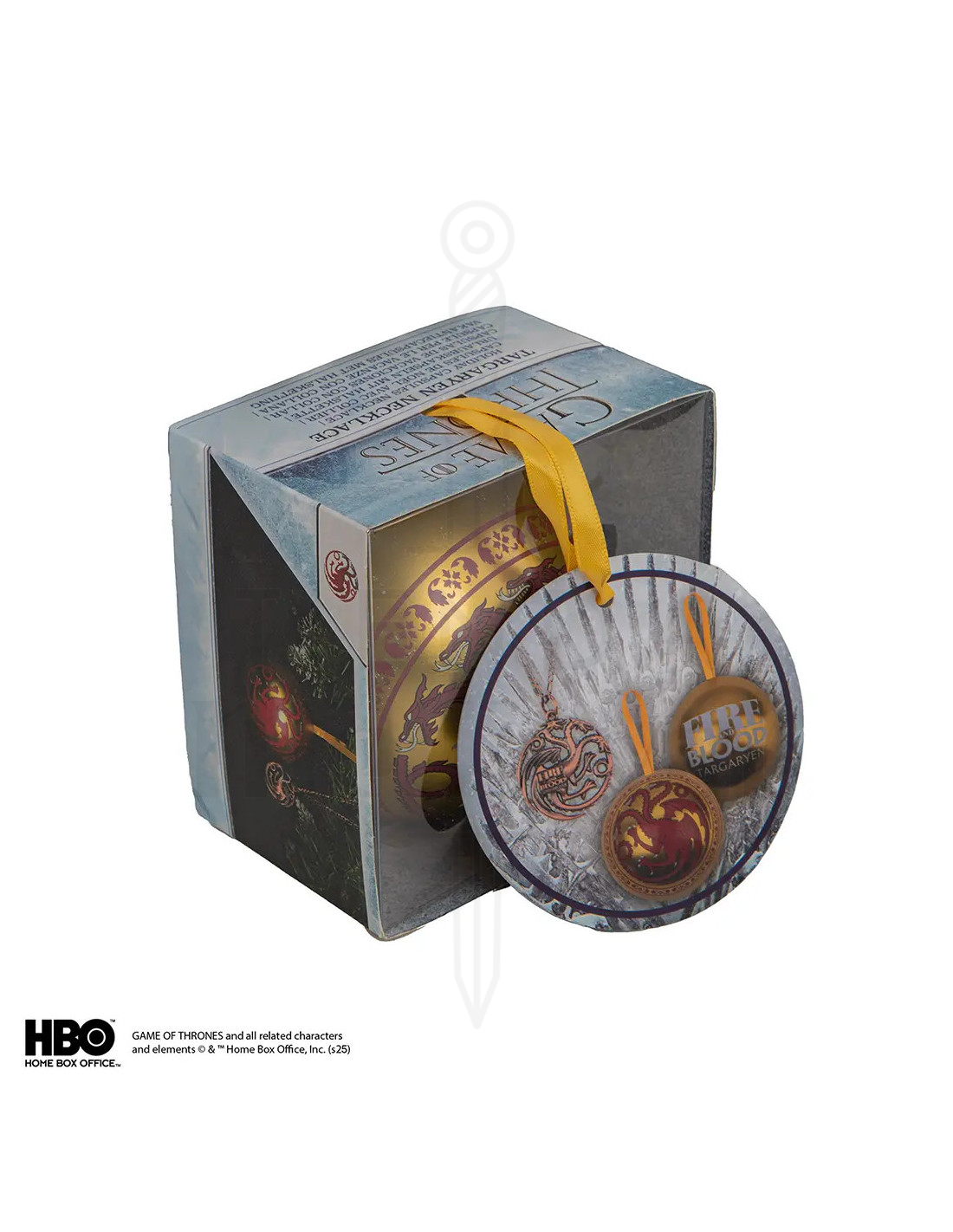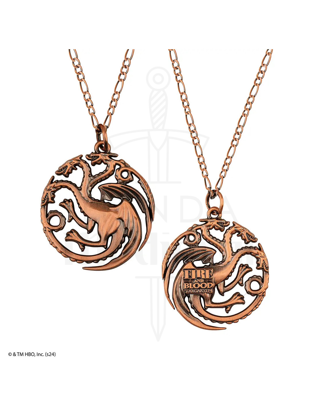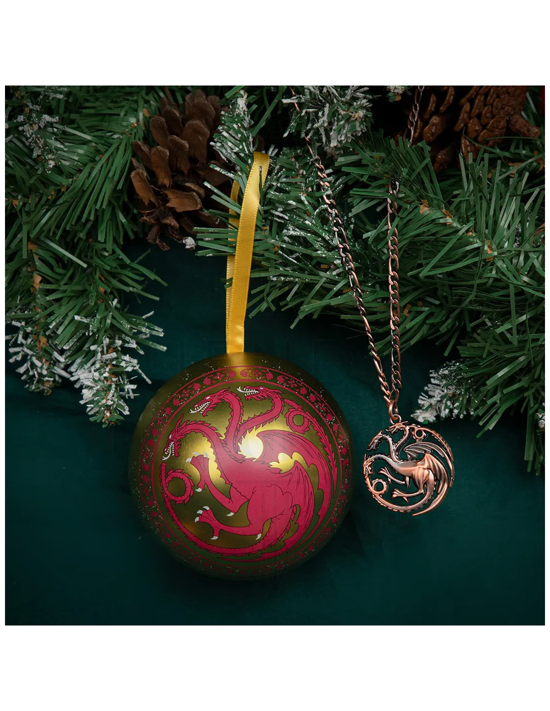 Il design combina una sfera decorativa dorata con tocchi di rosso scuro, e un ciondolo circolare in tonalità rame o bronzo, entrambi con l'emblematico drago a tre teste. Questa mescolanza di calore lucente e dettagli scuri dona un'aura di mistero e autorità, perfetta per chi vuole manifestare presenza senza dire una parola.