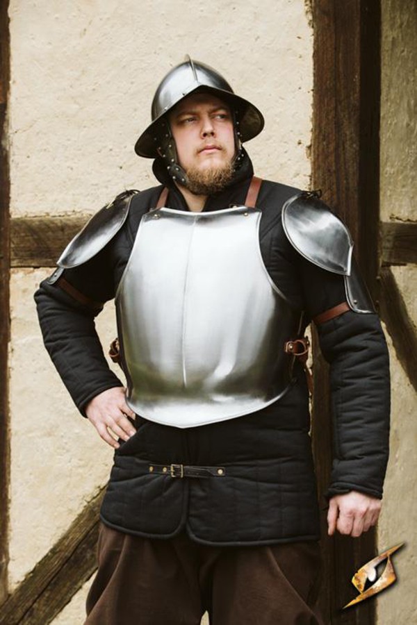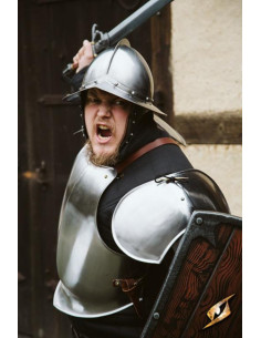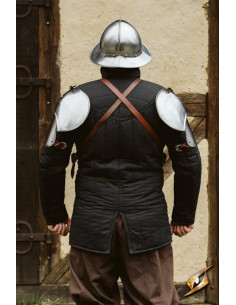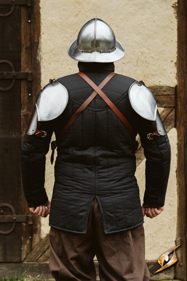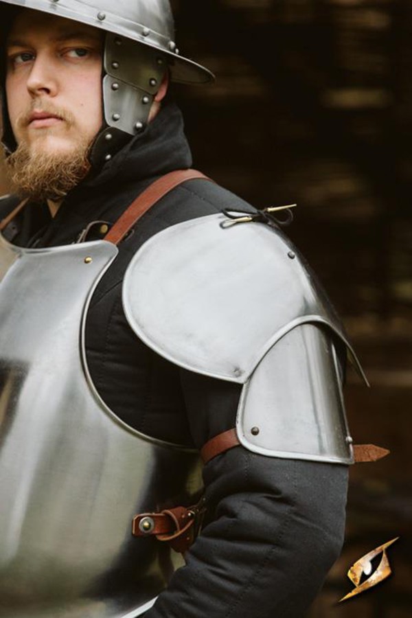 Le spalline sono un altro componente chiave di questo set. Realizzati con un'unica piastra curva, offrono una protezione eccezionale alla parte superiore delle braccia. Sono tenuti saldamente con cinghie di cuoio attorno ai bicipiti e alle spalle e attaccati a una corazza e una piastra posteriore con una tracolla in pelle regolabile. Sarai pronto ad affrontare qualsiasi attacco senza preoccuparti della tua sicurezza.