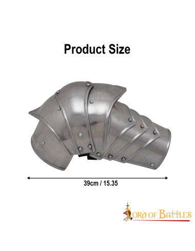 Pronti a distinguerti sul campo di battaglia con il pacchetto Spallacci e Armatura Gorget! Le spalline medievali con besaghe in acciaio nero del XV secolo, dette anche "ascelle", sono un gioiello stilistico. I suoi dischi flottanti a forma di rosetta offrono una protezione aggiuntiva garantendo allo stesso tempo un'eccezionale libertà di movimento. La sua vestibilità universale garantisce comfort a qualsiasi utente, con cinturini in vera pelle per una presa salda e duratura. Non accontentarti di meno!