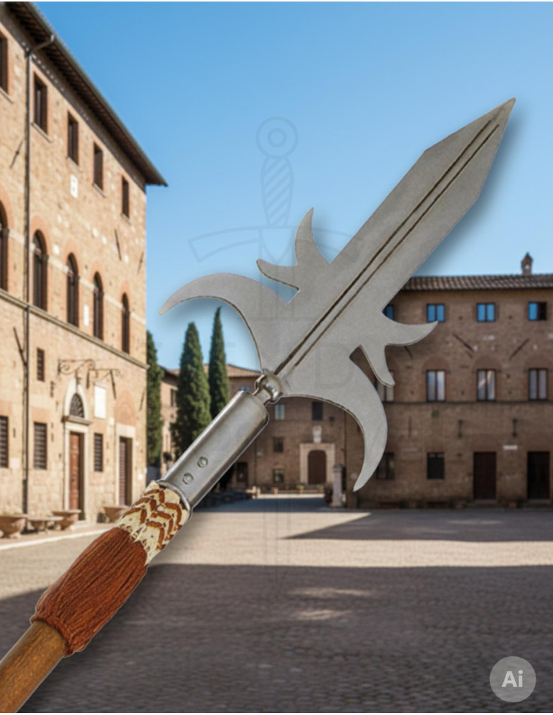 Con una lunghezza di 188 cm, questa lancia ti permetterà di distinguerti in qualsiasi evento o rievocazione storica. La sua larghezza di 19 cm lo rende un pezzo imponente e sorprendente.