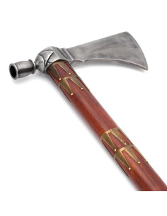 Con la sua testa forgiata in acciaio ad alto tenore di carbonio, questa pipa-tomahawk è forte e durevole, e il suo manico in legno intagliato a mano, decorato con bande di ottone, è una vera opera d'arte. Inoltre, il suo design unico e riccamente inciso lo rende perfetto per essere esposto in qualsiasi collezione.