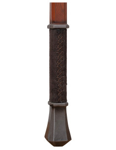 La sua testa, con un design accattivante che unisce un lato semi-circolare e un becco come quello di un corvo, non è solo visivamente impressionante, ma simula anche una superficie metallica testurizzata, evocando la forgia antica. I dettagli decorativi, come i rivetti visibili e i fori sulla parte superiore, conferiscono un'aria autentica e robusta, ideale per personaggi con armature pesanti o guerrieri fantasy. Il manico, in tonalità marrone e finitura liscia, è rinforzato con una copertura in pelle che garantisce una presa comoda e sicura, permettendoti di manovrare con fiducia in ogni momento del combattimento.