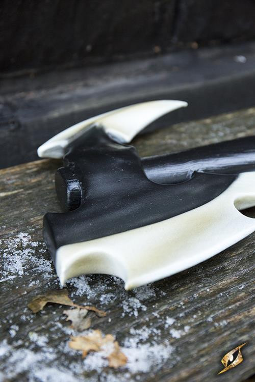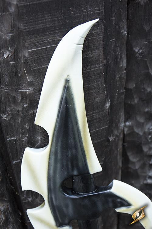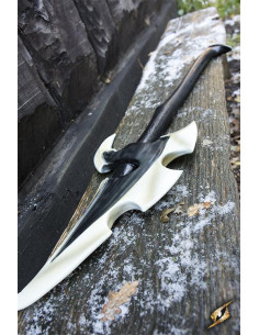 Questa impressionante arma in lattice è lunga 100 cm e presenta una testa d'ascia appuntita lunga 32 cm a forma di mezzaluna e seghettata, progettata per sembrare un artiglio o un osso. Il suo manico da 45 cm ha una finitura che simula il legno scuro, conferendogli un aspetto oscuro e misterioso.