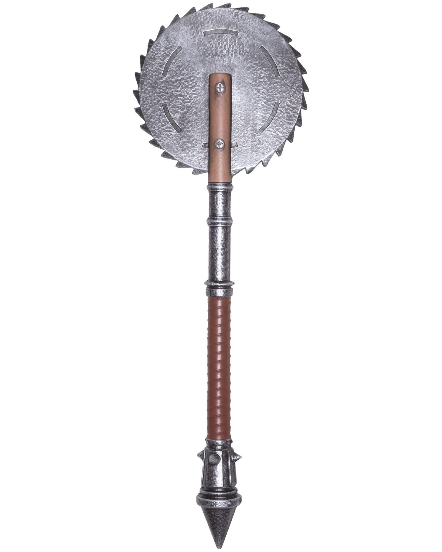 Nota i dettagli che aggiungono personalità e utilità: la lama circolare con denti è fissata con due viti visibili che rinforzano l'aspetto improvvisato, mentre l'asse diviso in tre sezioni migliora l'ergonomia. La sezione centrale avvolta in marrone con un motivo a spirale migliora la presa, e le parti metalliche testurizzate insieme alla punta conica finale completano una silhouette equilibrata e teatrale.
