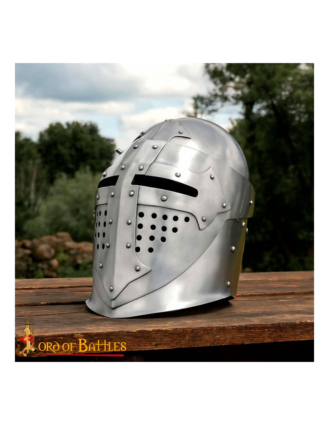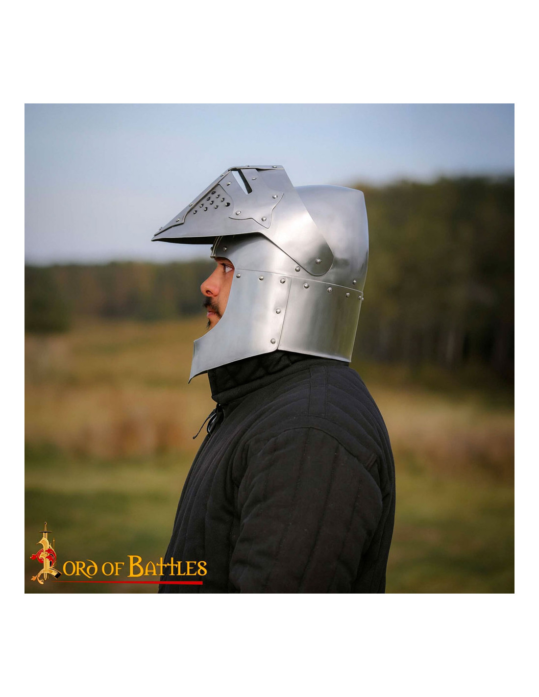 - Design versatile con visiera pieghevole: ispirato ai manoscritti storici, questo elmo presenta una visiera pieghevole che aggiunge versatilità al cavaliere. La possibilità di rinfrescarsi o bere senza togliere il casco è un dettaglio che fa la differenza in battaglia.