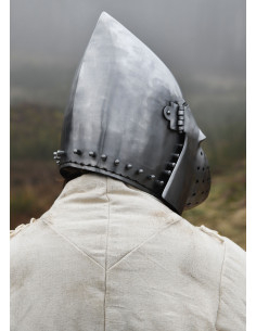 Funzionale bacinella medievale in acciaio con visiera tedesca, XIV secolo.