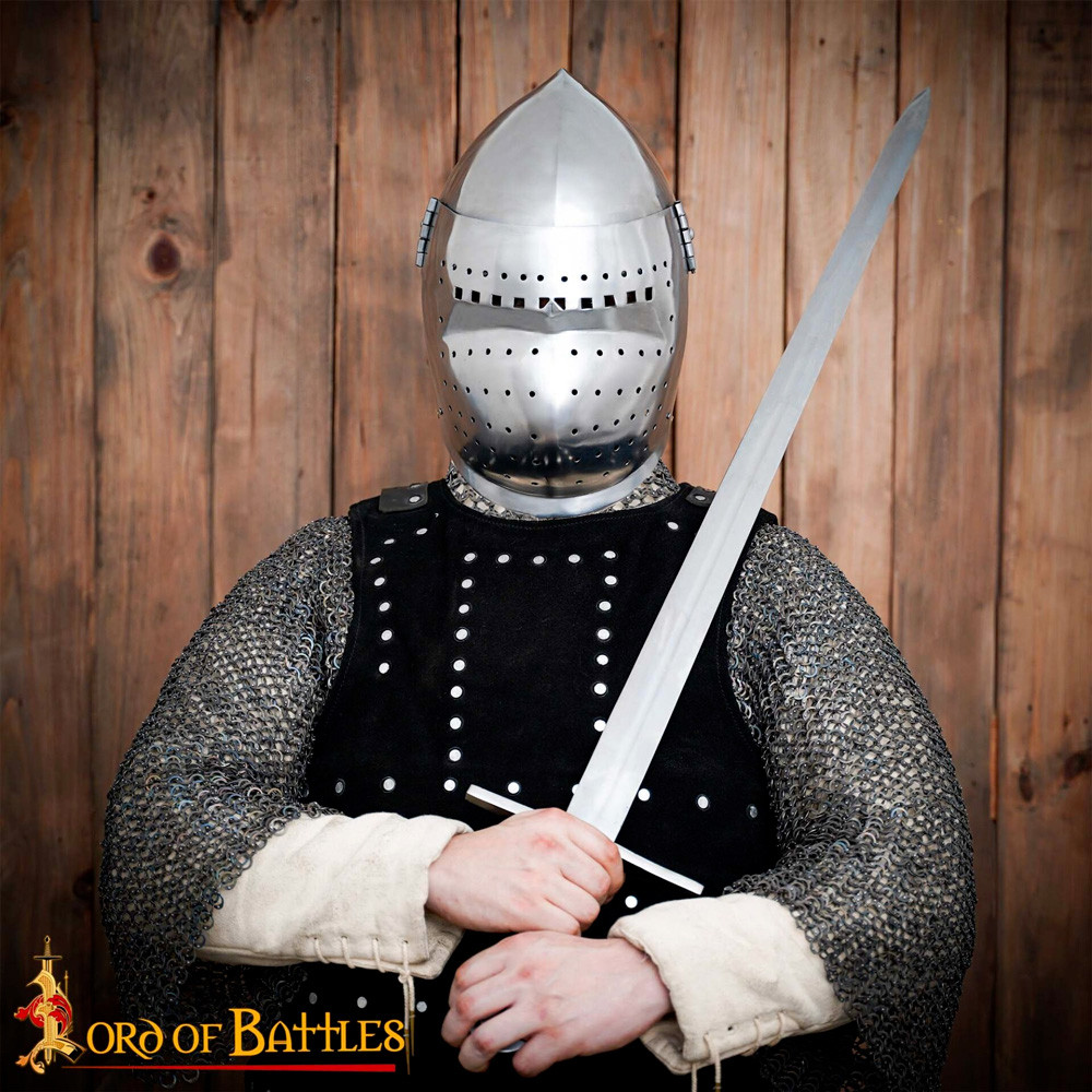 Acquistare questa barbuta è più di un semplice acquisto; è l'opportunità di possedere un frammento della storia medievale. Con la sua costruzione artigianale e la sua finitura protetta contro la ruggine, sarai pronto ad affrontare qualsiasi sfida, sia in una battaglia simulata che in un'esposizione museale.