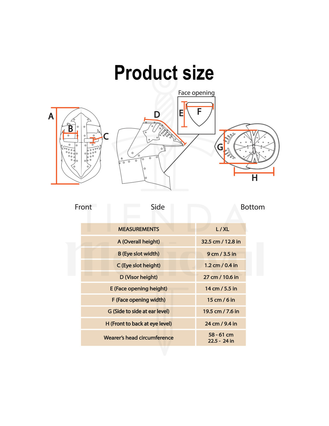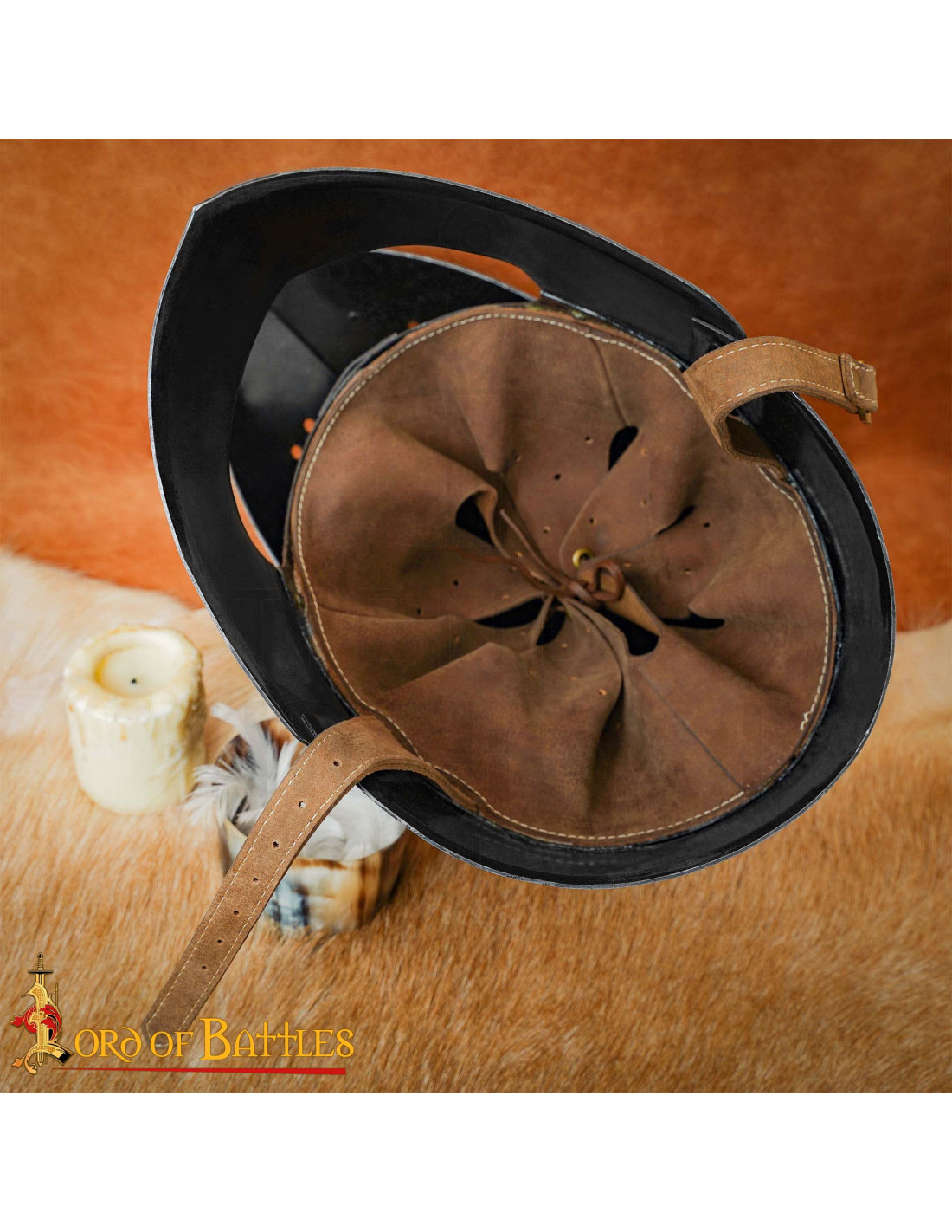 La finitura annerita e il set di rivetti visibili creano un'estetica robusta e autentica, perfetta per coloro che cercano fedeltà storica. La silhouette allungata verso la nuca non solo rinforza la protezione, ma eleva anche la presenza scenica quando lo indossi durante eventi o esposizioni.