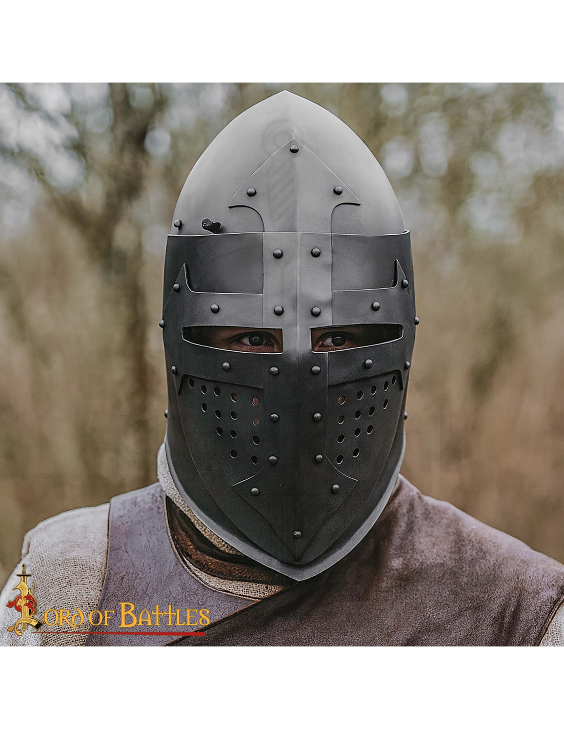 Questo bacinete medievale con visiera cavaliere XIV secolo, finitura annerita offre protezione completa del volto senza sacrificare il comfort, grazie a una visiera ribaltabile che consente di controllare la visibilità e la ventilazione in ogni movimento. Il design con fessura orizzontale di visione e fori circolari assicura che tu possa mantenere il vantaggio tattico, respirando facilmente mentre mantieni una linea visiva sicura.