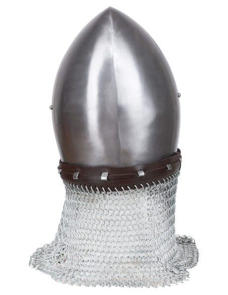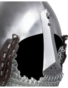 Il design conico e lucido proietta un'estetica storica raffinata, perfetta per coloro che cercano autenticità senza rinunciare alla praticità. La superficie liscia dell'acciaio e il rinforzo frontale che copre il naso non solo migliorano il suo aspetto, ma proteggono l'area facciale in modo discreto, lasciando spazio per una buona visibilità quando preferisci una maggiore apertura.