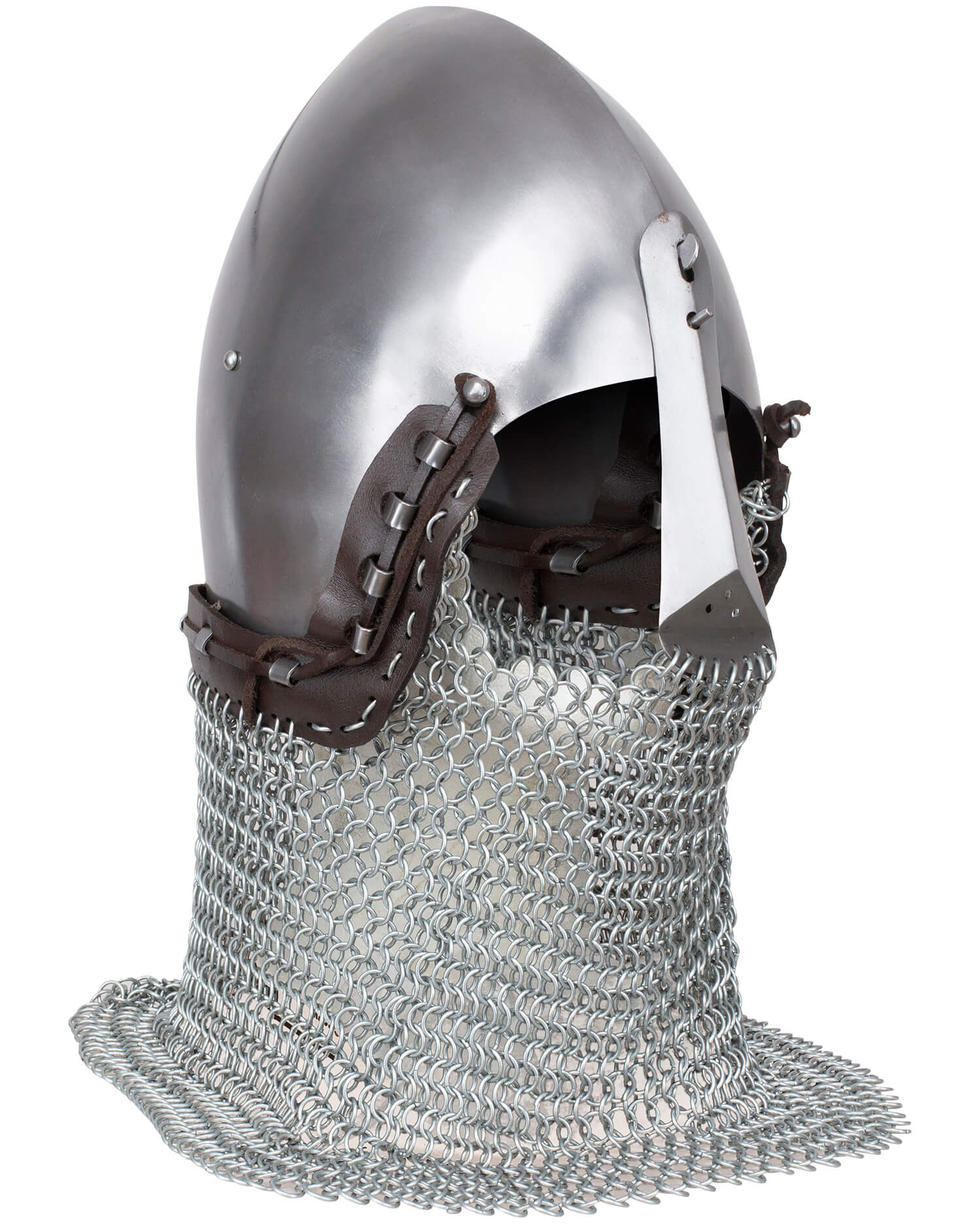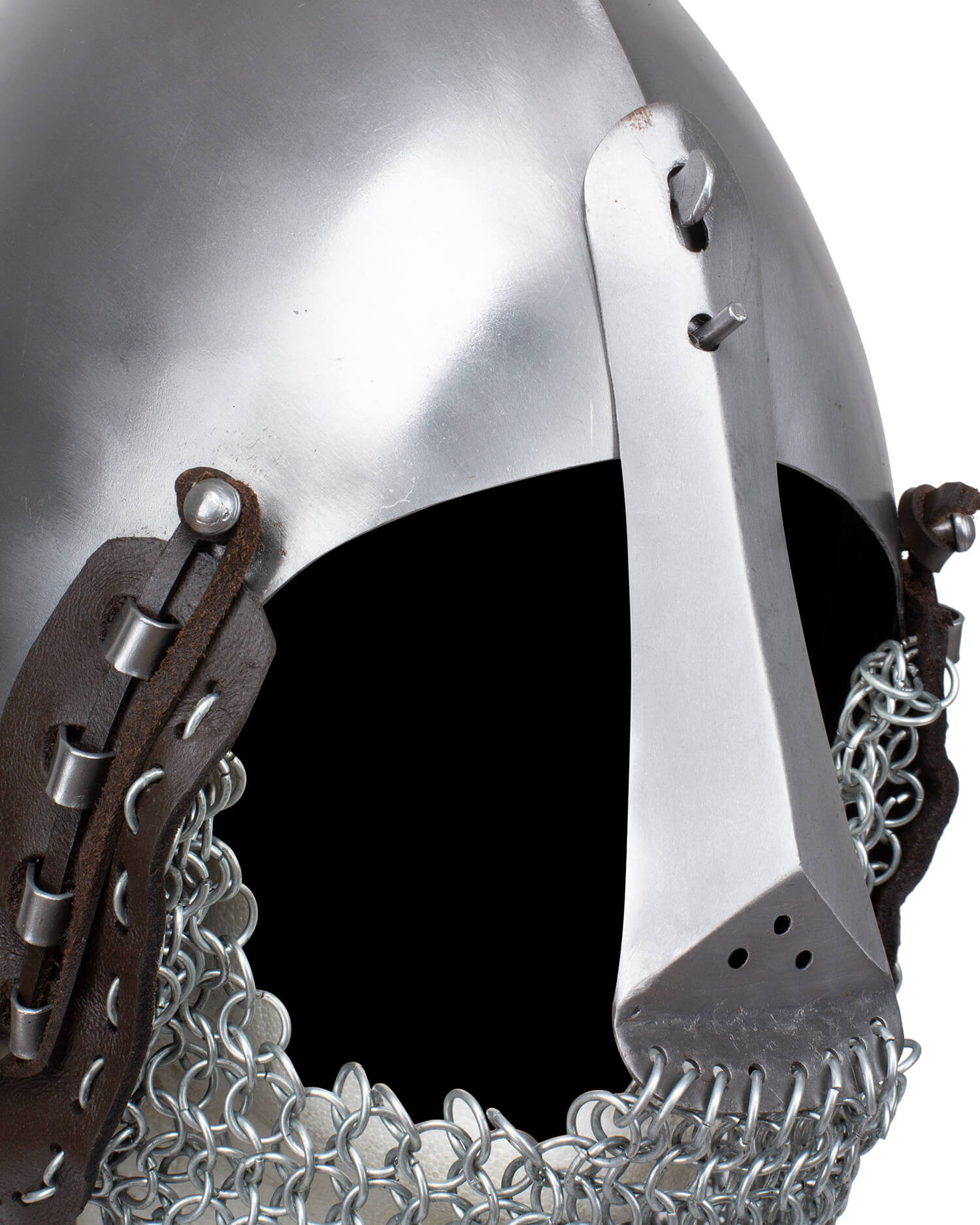 La maglia attaccata alla base protegge collo e spalle offrendo mobilità e sensazione di sicurezza, grazie ad anelli compatti che sfiorano dolcemente e si adattano al movimento. L'unione tra casco e maglia è assicurata da linguette in cuoio con cuciture visibili e rivetti, che garantisce un fissaggio robusto e una finitura funzionale che si distingue in foto e scenari allo stesso modo.