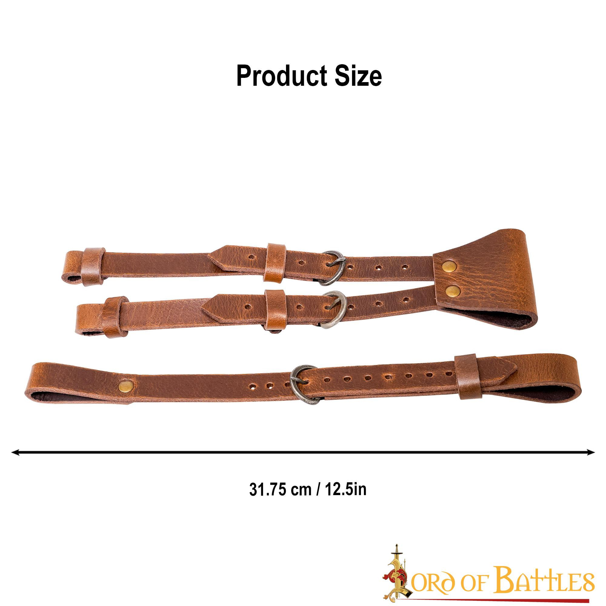 Con questo baldric, puoi portare la tua spada comodamente e in sicurezza, senza preoccuparti che scivoli o si danneggi. Le 3 cinture in pelle offrono grande stabilità e resistenza, assicurando che la tua spada rimanga al suo posto durante le tue avventure o battaglie.