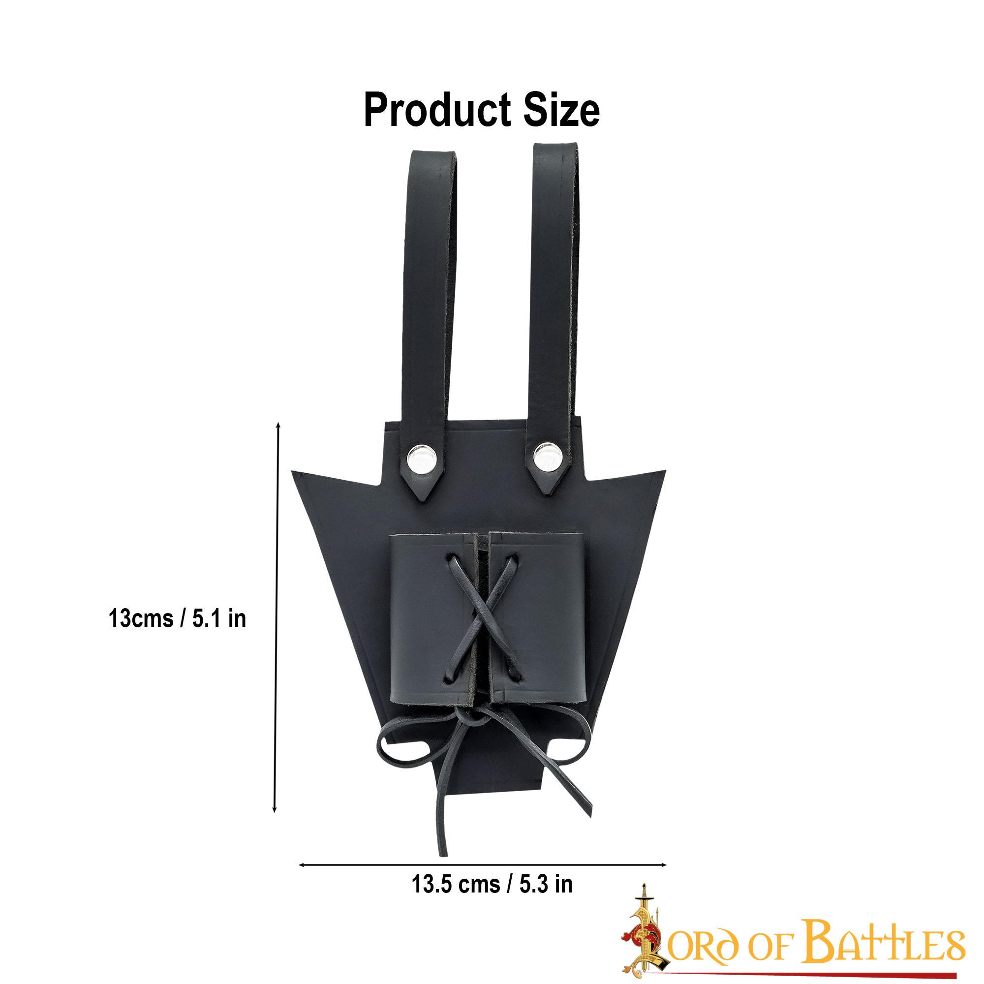 Questo baldric in pelle marrone è meticolosamente realizzato a mano in vera pelle di bufalo e presenta cinghie regolabili per adattarsi a diverse dimensioni di armi come spade e asce. I passanti sono attaccati a chi li indossa con rivetti in ottone antico che possono essere facilmente montati su una cintura larga fino a 10 cm. Le sue dimensioni sono di circa (13 x 13,5) cm.