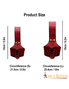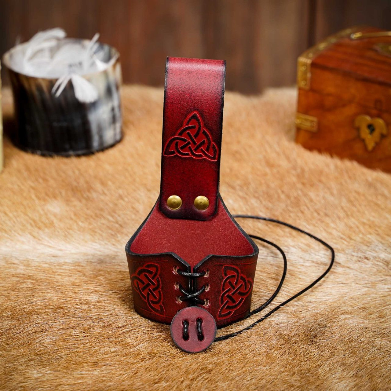 La nostra bandoliera in corno realizzata a mano, in una distinta tonalità bordeaux e caratterizzata da un accattivante design con nodo celtico in rilievo, è il complemento perfetto per il tuo corno di idromele. Questa bandoliera non è solo un pezzo funzionale, ma anche un simbolo di stile ed eleganza che ti accompagnerà in ogni viaggio e avventura.