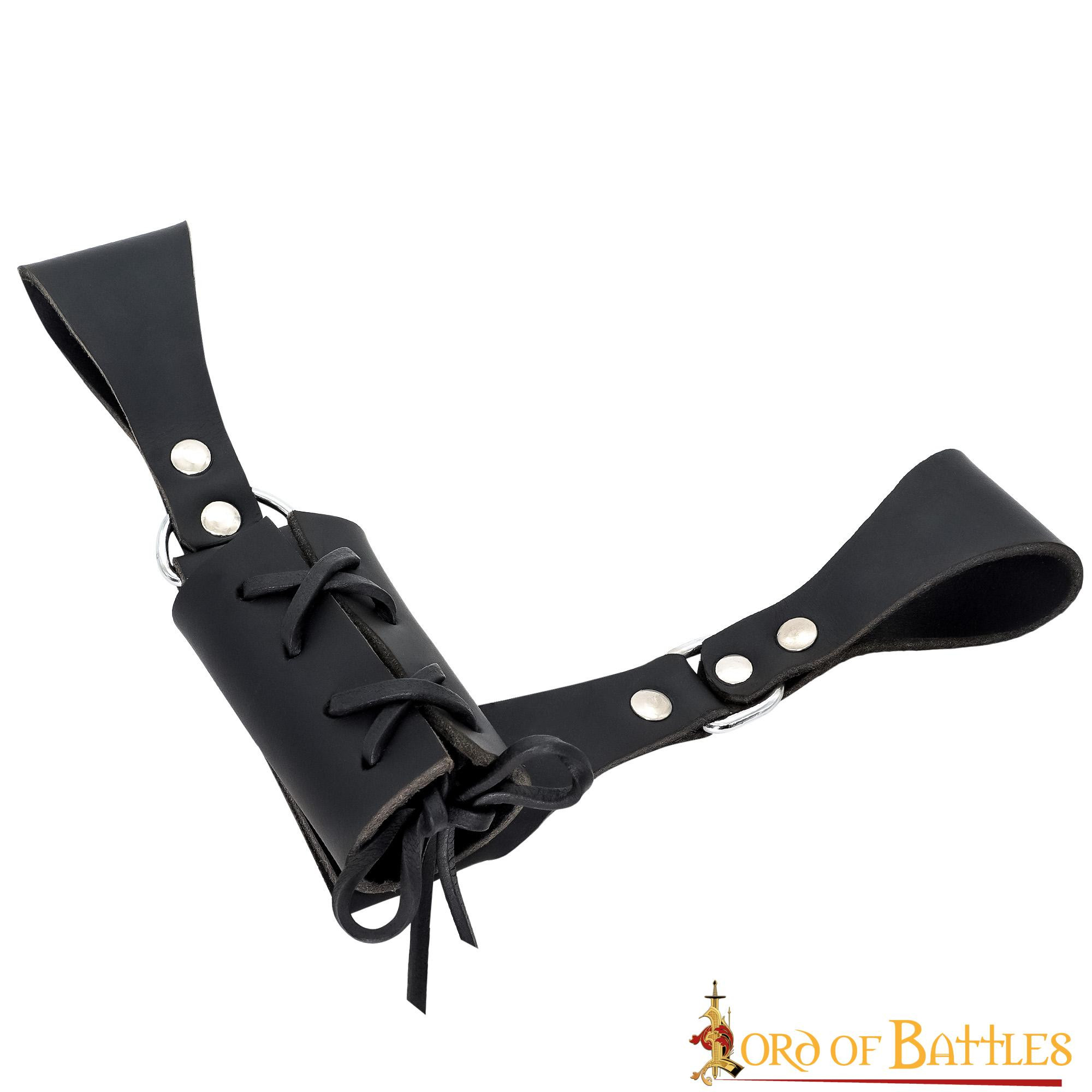 Realizzata a mano in vera pelle color cuoio spessa 3-3,3 mm, questa bandoliera è resistente e durevole, garantendo che le tue armi rimangano al sicuro anche nei momenti più intensi della battaglia. I rivetti antichi in puro ottone aggiungono un fascino vintage a questo accessorio indispensabile per ogni guerriero medievale.