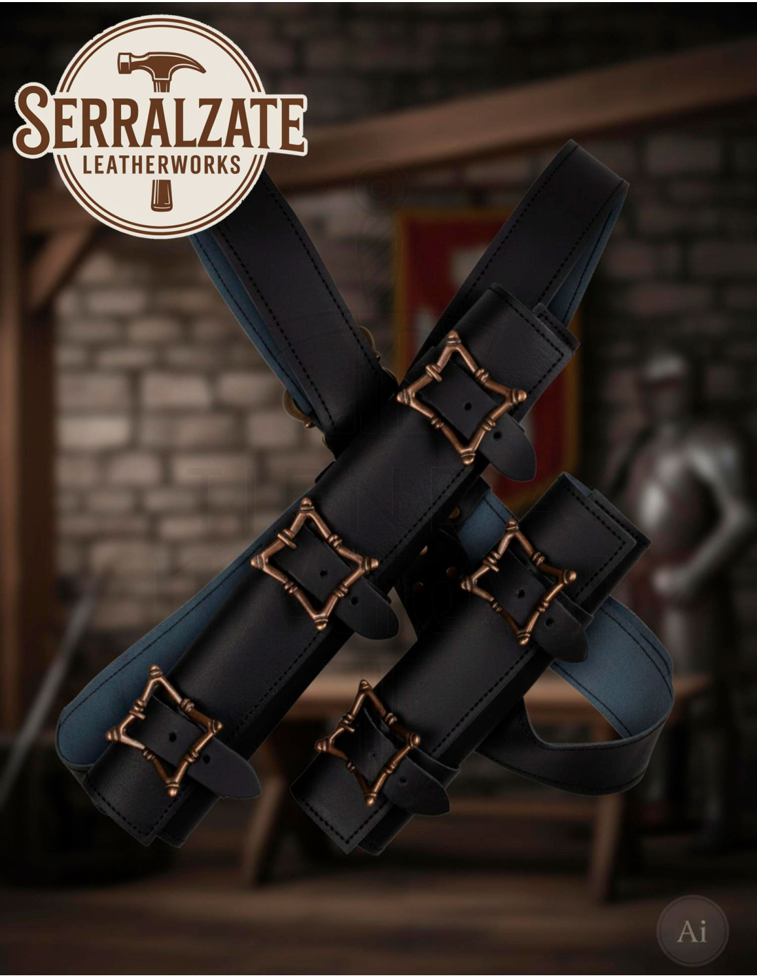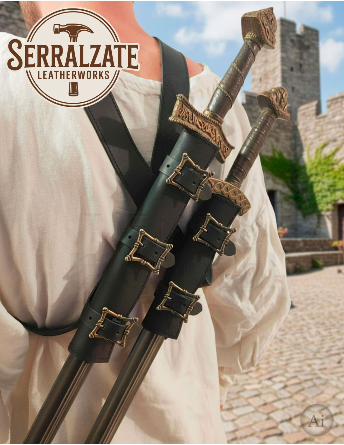 Scopri il **Doppio fondina per spade con cintura per LARP** di Serralzate LeatherWorks, un capolavoro artigianale progettato appositamente per coloro che cercano qualità, funzionalità e stile. Realizzato in pelle resistente e con fibbie in metallo con finitura bronzo invecchiato, questo sistema di cinghie è l'alleato perfetto per le tue avventure dal vivo. Il suo design simmetrico consente di trasportare comodamente due spade, ognuna nella propria custodia, offrendoti un accesso rapido e sicuro durante gli eventi.