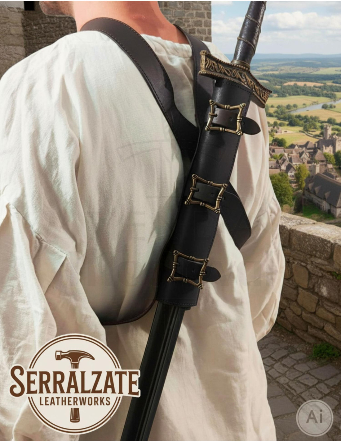 Scopri il tahalí con cintura per appendere la spada sulla schiena di Serralzate LeatherWorks, un accessorio unico e funzionale progettato per gli amanti della qualità e dello stile artigianale. Realizzato in resistente pelle nera, questo sistema di cinghie combina comfort e design eccezionale, ideale per trasportare la tua spada in modo sicuro e accessibile.