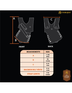 Realizzato in cuoio resistente, la sua finitura nera intensa conferisce un tocco elegante e si adatta a qualsiasi abbigliamento medievale o fantasy. La sua struttura, che ricorda un'imbracatura o una corazza, offre copertura e stabilità grazie alle sue varie sezioni e rivetti che assicurano una vestibilità sicura. Inoltre, dispone di un sistema di lacci nella parte inferiore che permette di regolarlo comodamente, garantendo che rimanga perfettamente fissato al torso.