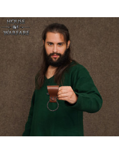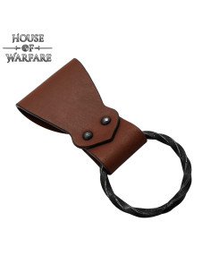 Realizzato in vera pelle di spessore spesso, pensato per resistere a anni di utilizzo in eventi LARP, fiere medievali o nella vita quotidiana. La sua finitura in tono marrone intenso e la sua texture naturale riflettono l'artigianato della vecchia ferreria, con doppio rivettamento che garantisce una presa salda e sicura. L'anello intrecciato, fatto a mano con ferro battuto e finitura nera, aggiunge un carattere autentico e resistente, ideale per appendere armi come asce, spade o strumenti essenziali.