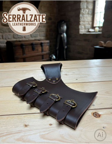Cerchi un portespada che combini funzionalità e stile medievale? Questo tahalí Jacan, realizzato in pelle marrone scuro di alta qualità, offre una soluzione robusta e adattabile per le tue avventure. Il suo design presenta quattro cinturini che permettono di regolare con precisione diverse larghezze di spada, garantendo una presa sicura e confortevole in ogni momento.