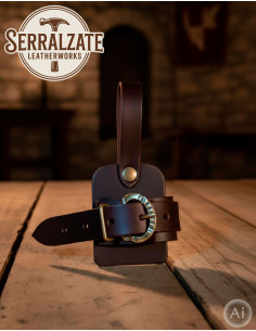 La sua dimensione ridotta e regolabile lo rende ideale da appendere alla cintura, alla spada o al pugnale, adattandosi perfettamente allo spessore della lama grazie a una cinghia con fibbia che permette di regolare la larghezza senza complicazioni. Questo assicura che le tue armi siano saldamente fissate e facilmente accessibili in ogni momento.