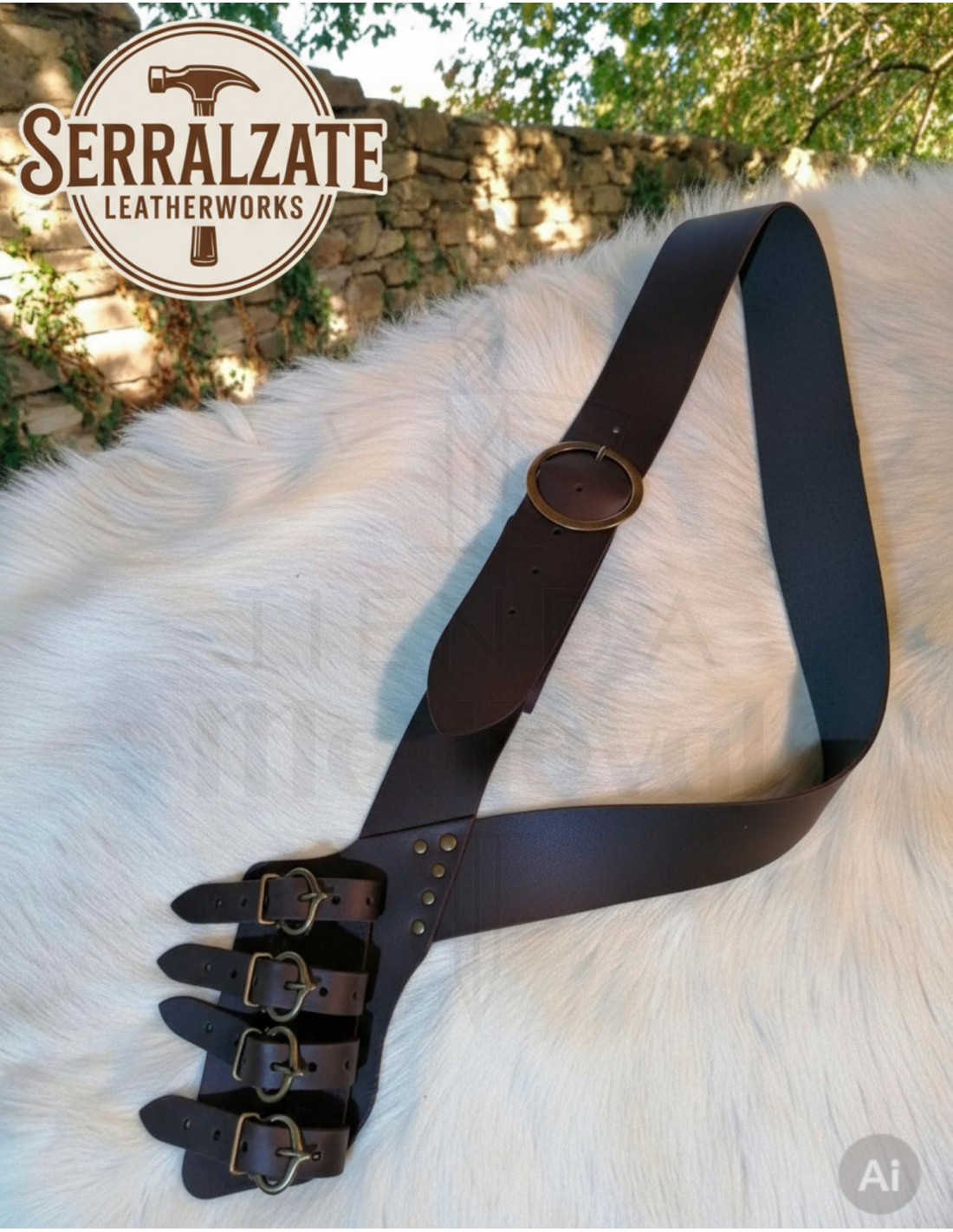 Vuoi apparire autentico e pratico nelle tue ricostruzioni o collezioni medievali? Questo tahalí tipo bandoliera auto-regolabile in marrone è la scelta perfetta per portare la tua spada con stile e comodità. Realizzato a mano da artigiani specializzati in pelle di massima qualità, il suo finissaggio in colore marrone conferisce un aspetto solido ed elegante che si abbina a qualsiasi abbigliamento storico.