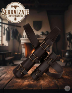 Scopri il Doppio sospensorio per spade con cintura per LARP di Serralzate LeatherWorks, un capolavoro artigianale progettato specialmente per chi cerca qualità, funzionalità e stile. Realizzato in cuoio resistente e con fibbie in metallo con finitura bronzo invecchiato, questo sistema di cinghie è l'alleato perfetto per le tue avventure dal vivo.