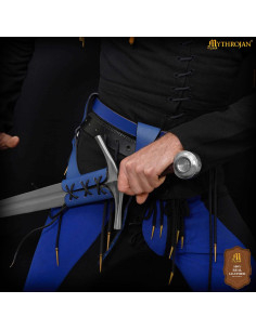 Questo fodero in vera pelle presenta un design artigianale che trasforma la rigidità della pelle in una sensazione di adattamento naturale, permettendo all'accessorio di adattarsi al tuo movimento e mantenere il pezzo al sicuro senza infastidirti. La finitura blu con bordi neri e dettagli metallici argentati aggiunge un elegante contrasto visivo, ideale per eventi storici, convention e partite LARP in cui vuoi spiccare senza perdere funzionalità.
