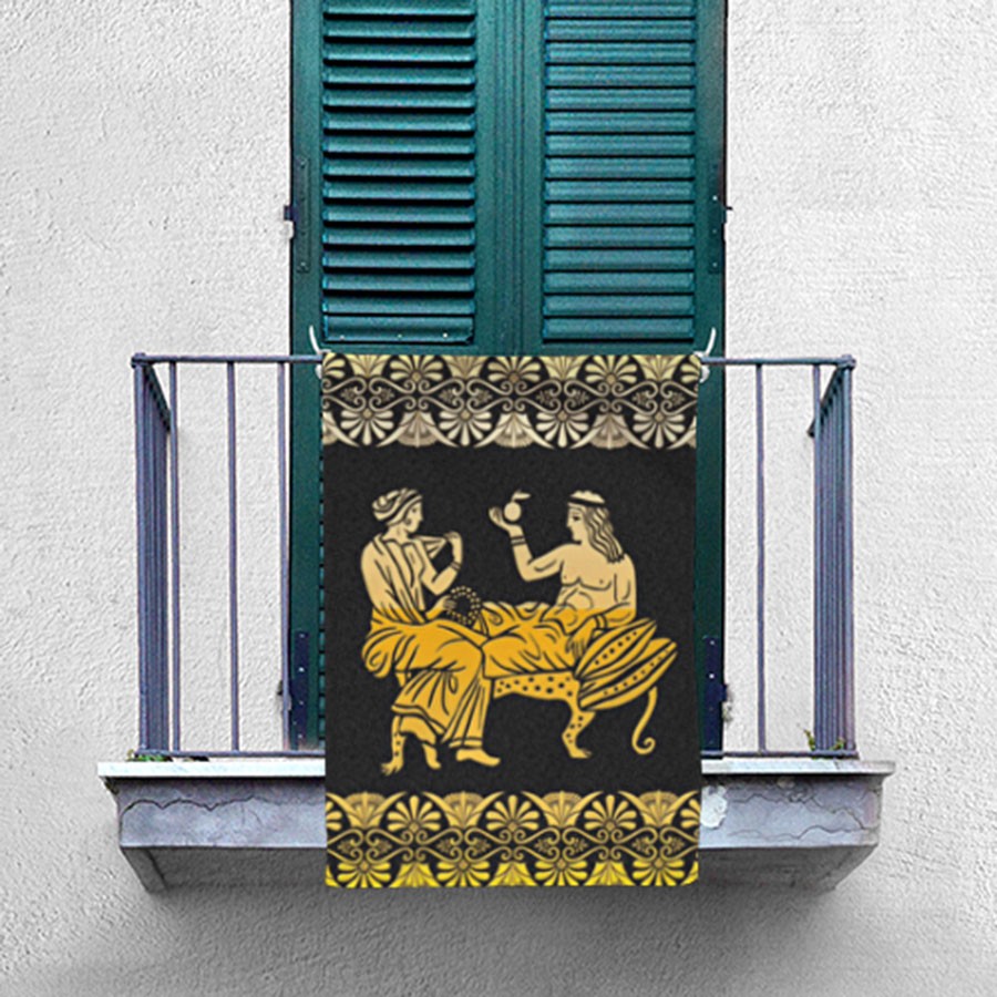 Questa bandiera, con una dimensione di 70x100 cm e nastri accuratamente progettati per essere annodati, non si limita a decorare, ma crea un'atmosfera che invita a immaginare momenti di tranquillità e piacere, come quelli degli antichi greci. L'intensità dei suoi colori vivaci e la cura nei dettagli catturano l'attenzione, facendo sentire i tuoi ospiti trasportati in un mondo dove il riposo era un'arte e il tempo libero, una virtù. È molto più di un semplice elemento decorativo—è una dichiarazione di apprezzamento per la tua cultura e il tuo stile di vita.
