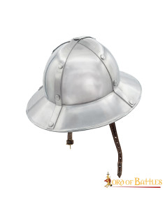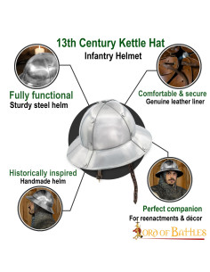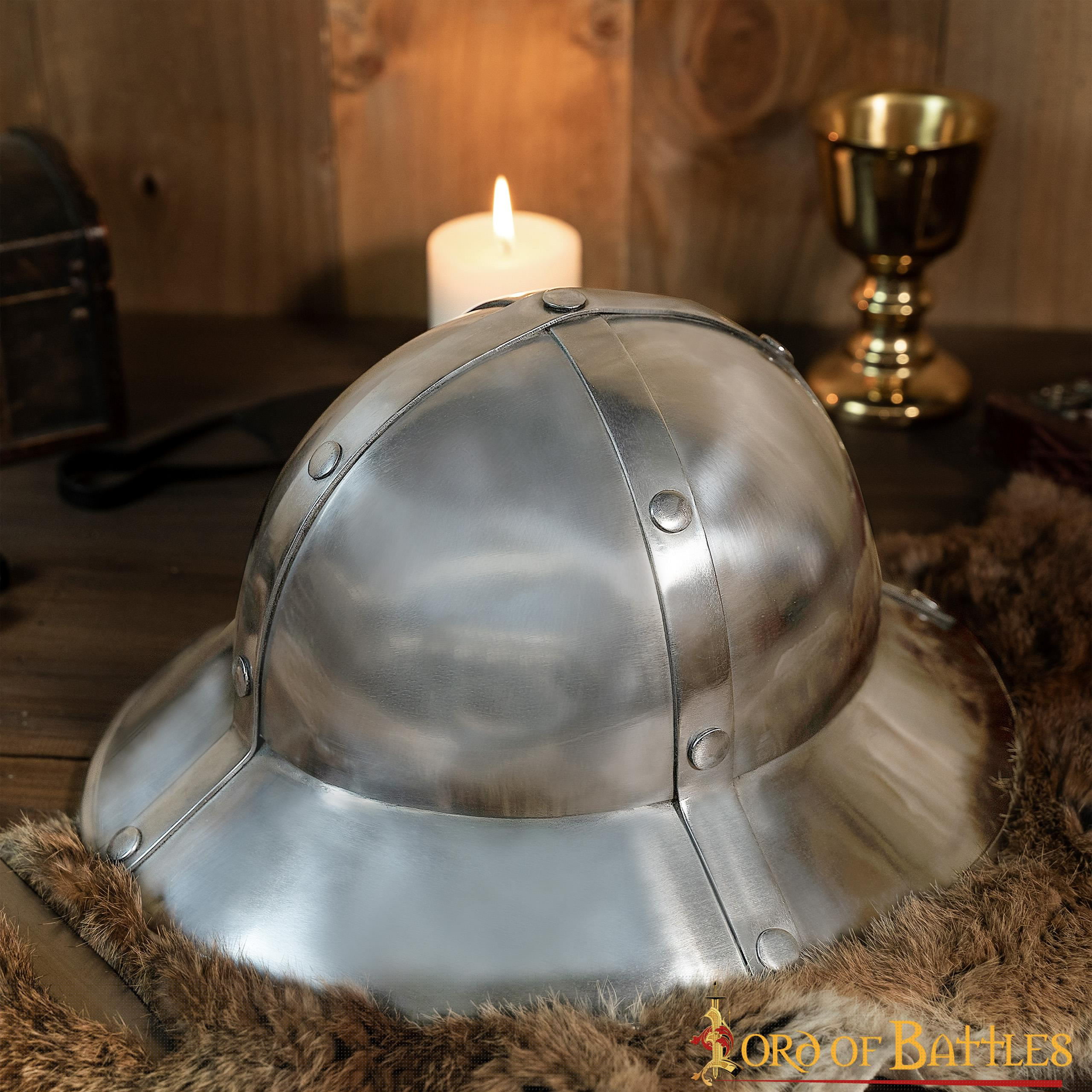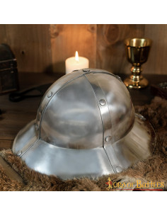 Il Kettle Helmet, chiamato anche 'Chapel de Fer' in francese, è l'elmo ideale per fanti, balestrieri, lancieri e vougiers. Era molto popolare tra gli eserciti medievali grazie alla sua versatilità e al perfetto equilibrio tra protezione e mobilità. Abbinalo semplicemente a una delle nostre cuffie in cotta di maglia e avrai una combinazione ottimale per il tuo prossimo LARP o rievocazione, offrendo un look fantastico senza ostacolare la tua visione e la libertà di movimento.