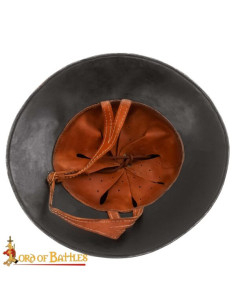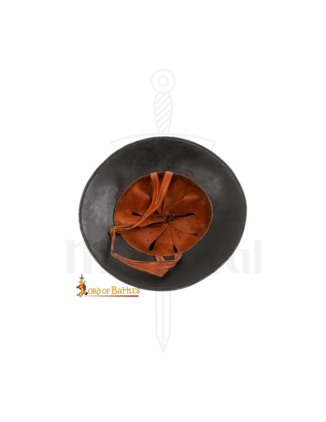 Questo elmo offre una protezione superiore contro colpi dall'alto, frecce e schegge, grazie al suo design con ampia visiera che devia gli impatti senza ostacolare la vista. La sua finitura lucida non solo esalta il suo aspetto in scena o in vetrina, ma facilita anche la manutenzione evitando il deterioramento prematuro, affinché appaia impeccabile utilizzo dopo utilizzo. La sospensione interna in pelle, regolabile, abbraccia la testa con comfort, riducendo l'affaticamento durante lunghe giornate di ricreazione o riprese e mantenendo l'elmo saldo durante movimenti intensi.