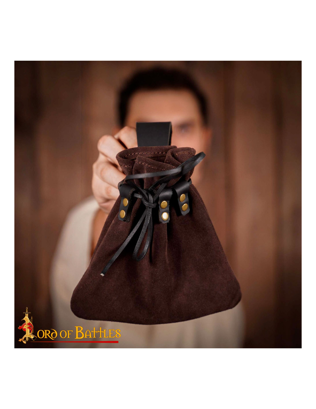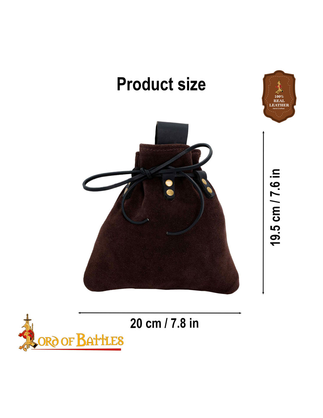Il marsupio medievale con chiusura a coulisse del prestigioso marchio Lord of Battles è un capolavoro artigianale realizzato a mano con vera pelle scamosciata. Il suo design accuratamente realizzato combina flessibilità e resistenza, rendendolo un compagno durevole che supererà qualsiasi altro artigianato in pelle.