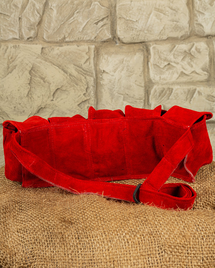 Realizzata in morbida scamosciata, questa cintura si distingue per il suo design accattivante e la sua versatilità. Ognuna delle cinque bustine è progettata con un flap che si chiude in modo sicuro con un bottone che simula la lucentezza del ottone, assicurando che i tuoi oggetti siano sempre protetti. Che tu abbia bisogno di portare i tuoi essenziali quotidiani o accessori per un'uscita speciale, questa cintura si adatta a tutte le tue esigenze.